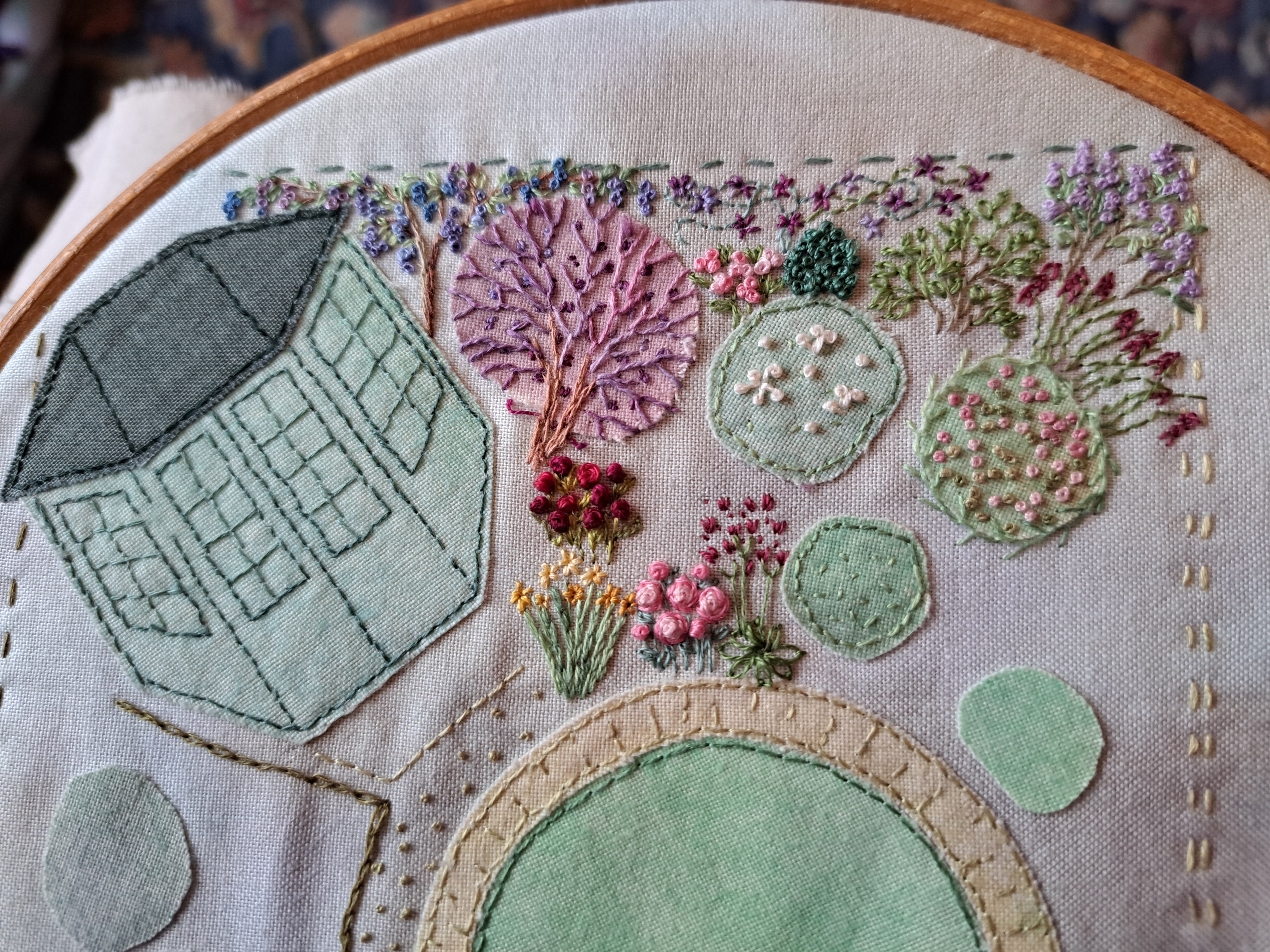 I love seeing how you individually embroider each flower and shrub. I love the wisteria, lilac tree and daylilies. The latter are some of my favorite flowers. I can easily imagine this garden. Enjoy your stitching!