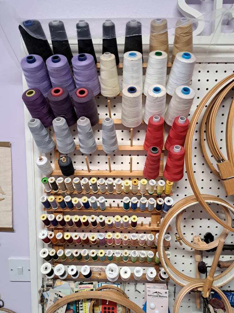 Sewing thread; reels are stored on open racks on my pegboard, a couple of years ago I bought a box of 60 Guterman threads, random colours, as it was such a good price. I have them on the pinboard sorted by colour. It has been helpful having a wide range of colour as invariably I have a thread which will match fabric enough. Overlocker threads (the big cones at the top) have been sorted too, some of them were very dusty, which doesn’t do your sewing machine any good. I realised it was just the top row that was really dusty, so after dusting them I rearranged them and put a sheet of plastic over the top row, it’s not noticeable but it will hopefully protect them a bit.