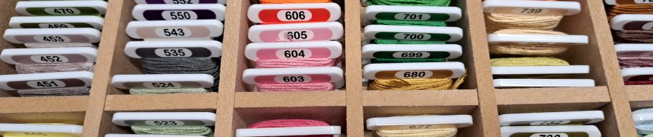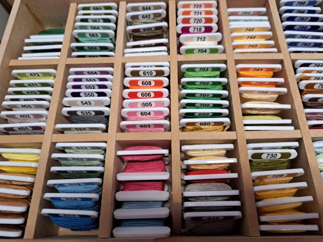 Hand embroidery threads are stored in these drawers. I keep the DMC in numerical order and special threads are organised purely by colour as that is often how I choose the thread and use it. A couple of years ago I treated myself to a set of Pip and Chip bobbins, I love them! Each acrylic bobbin is printed with the number and colour. Over the last couple of days I’ve also sorted out my spare skeins of DMC, I inherited a few when we cleared my mum’s house and someone on facebook recently was selling 100 skeins for about £30…so I’ve a few spares now! I’ve put them all together in a box with a notebook listing all the numbers so I can easily check if I have a spare when one runs out.