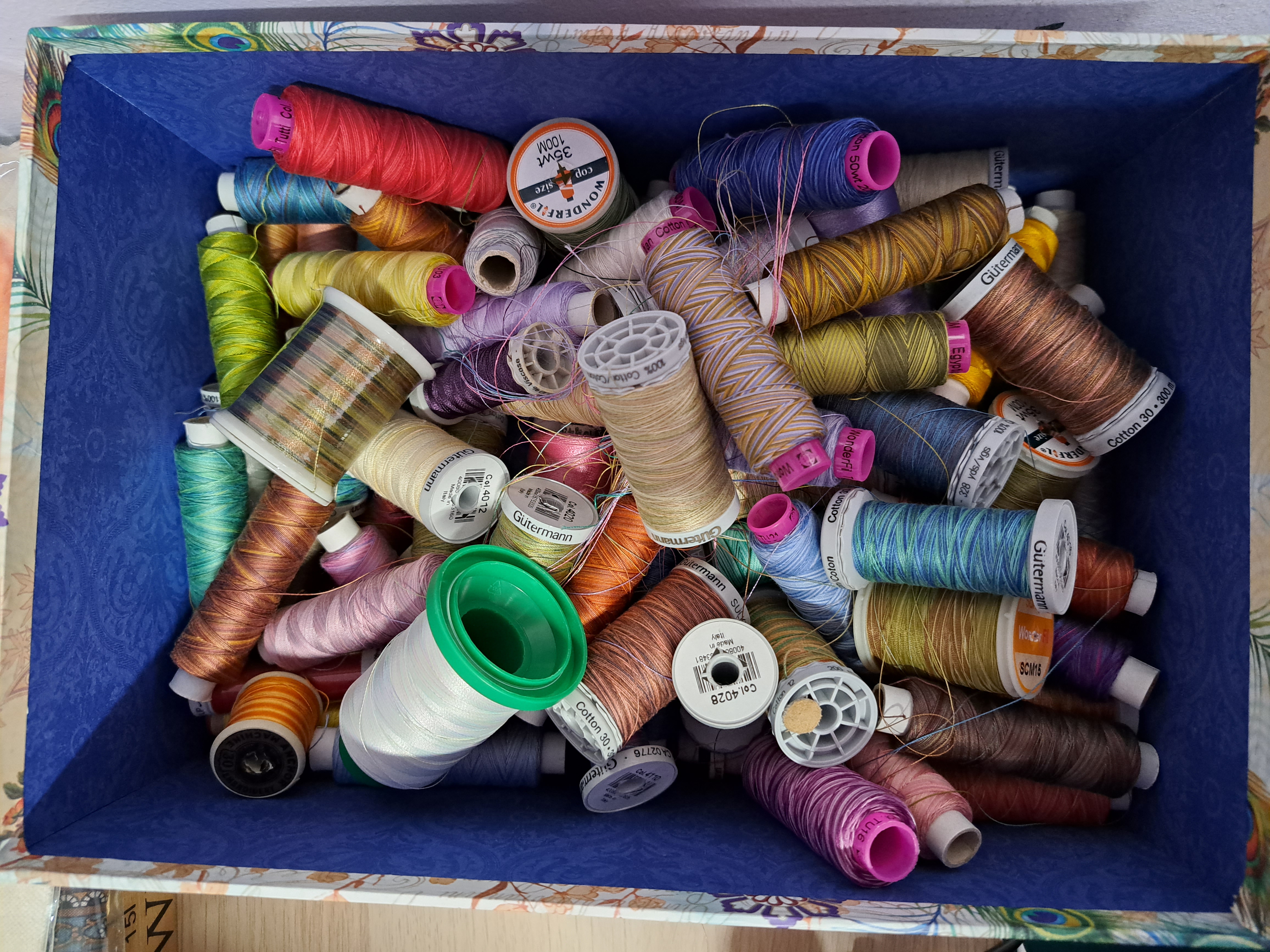 The latest daily challenge to declutter my sewing room certainly took more than a day! I’m doing the declutter challenge from Karen of Just Get It Done Quilts, each daily prompt is on youtube, I think there’s 21 challenges with the idea that you start on January 1st. I was very late getting to the party, I didn’t hear about it until February. I’ve been working on Day 9 but it’s taken quite a while as it’s all about threads…of any sort!!! As I sew, quilt and embroider, I have rather a lot of threads, all different types…