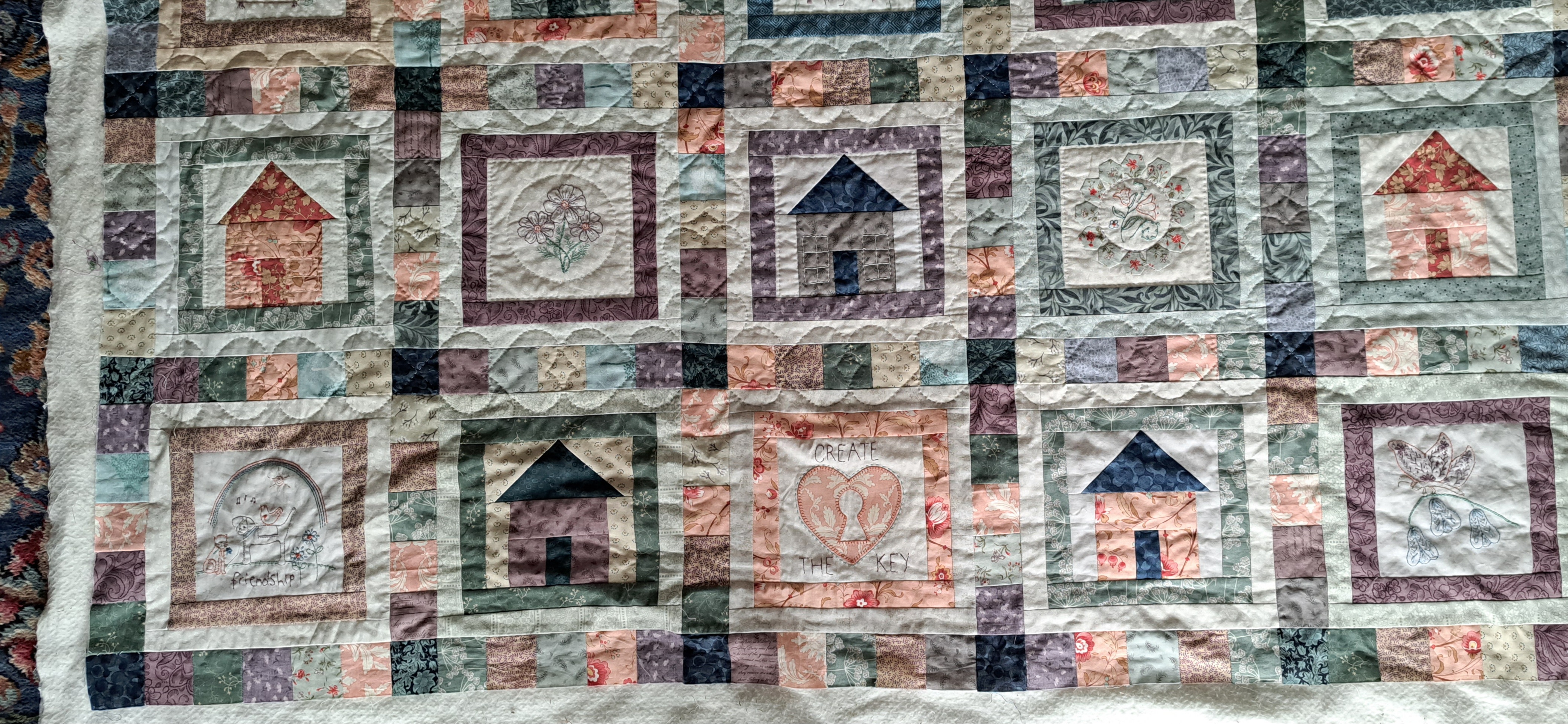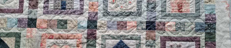 So all that’s left to quilt is the house block and the embroidered block on the left of the bottom row together with their length of sashing. Hopefully in three weeks time I’ll have quilted and bound it and be dancing round my sewing room!