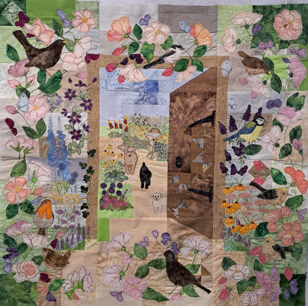 The final block was the central one with a view into the garden and a cat sitting washing himself. Whilst he did look like a cat I had many years ago, I decided instead to try and incorporate our three dogs which we had up to the last couple of years.