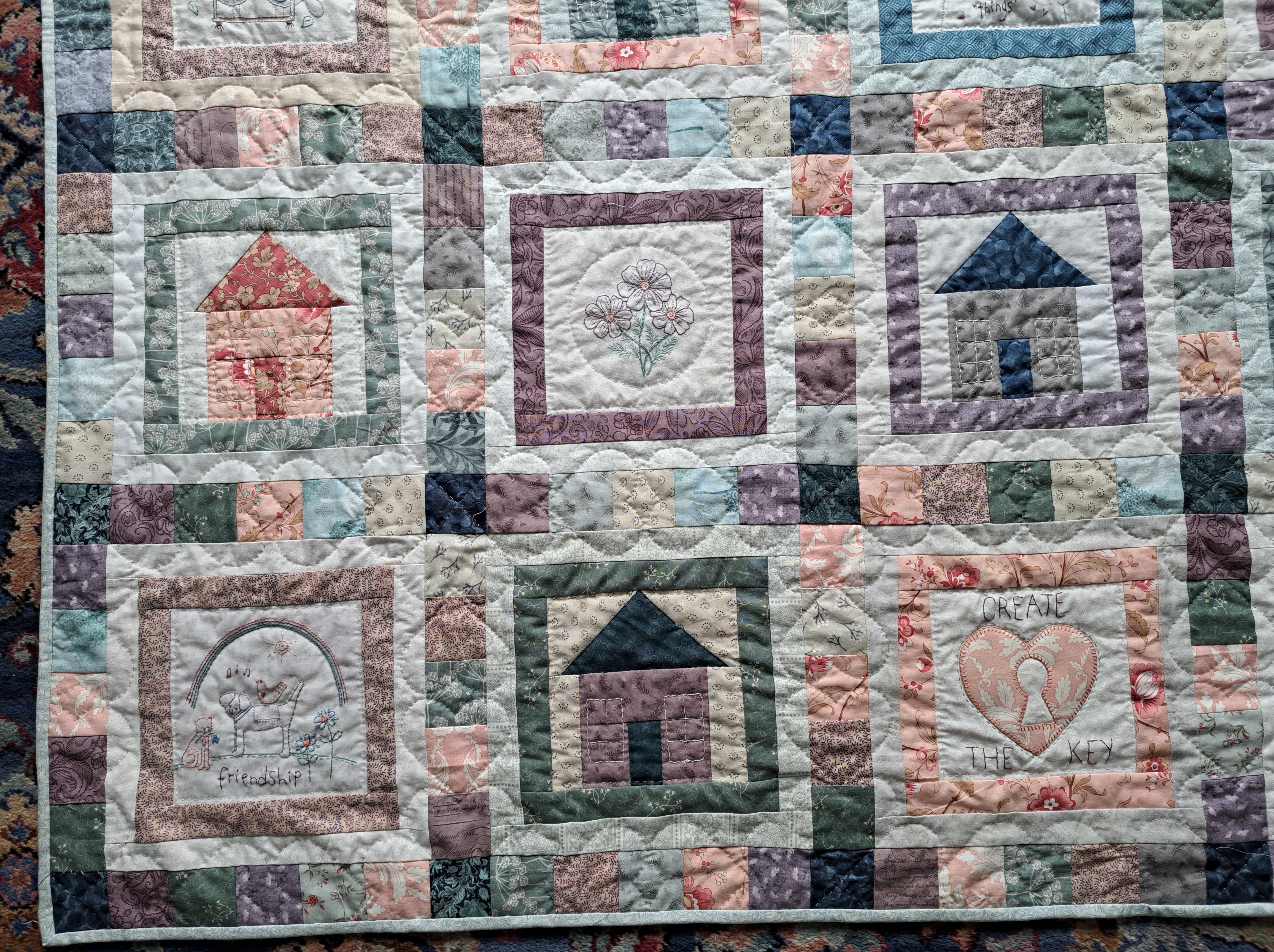 There were twenty embroidered and appliqued blocks altogether, all finished to 6″ square. To make it into a useable bed quilt I made twenty simple house blocks, double bordered each block and used most of my last fabric scraps to make the scrappy sashing. I love the way the colours have worked out.