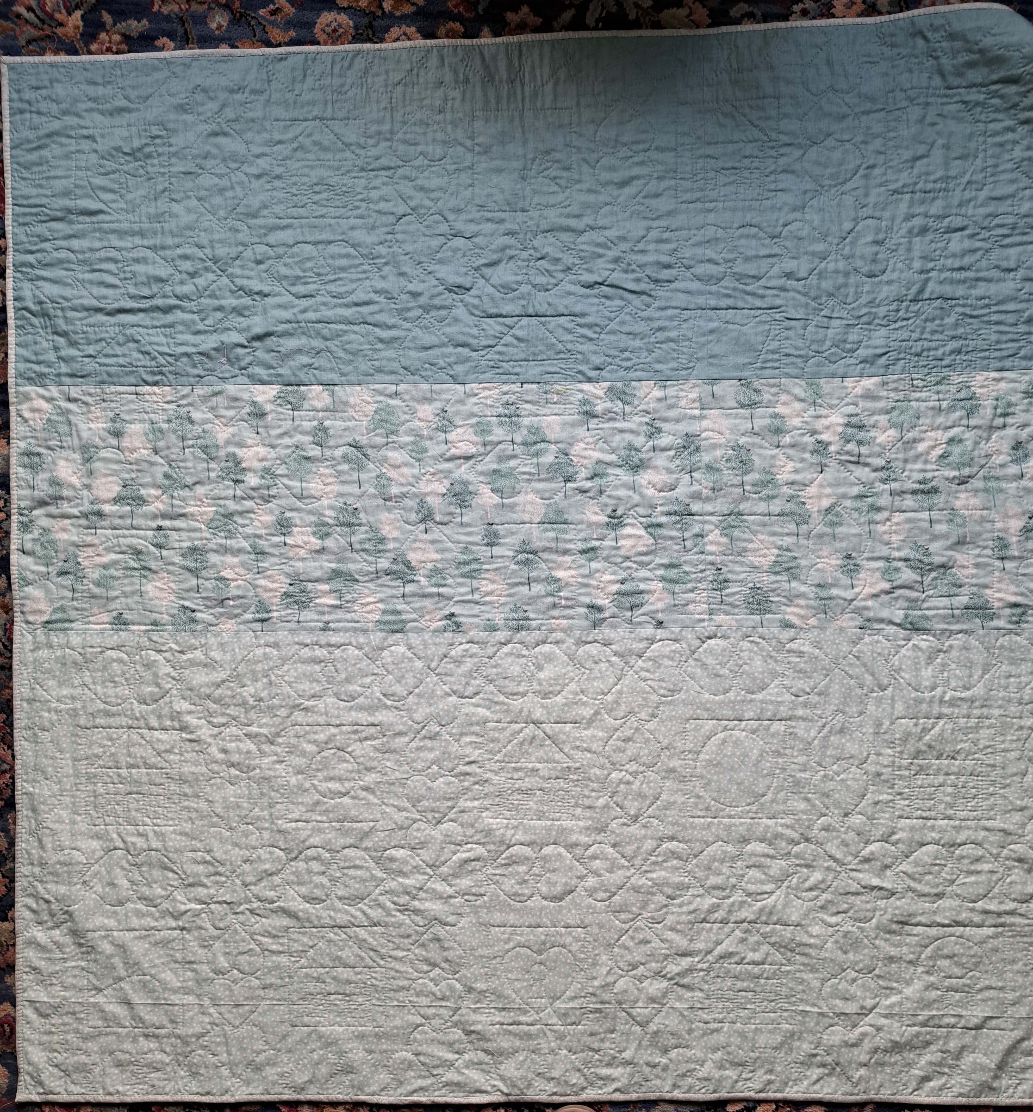 Over the last three weeks I’ve finished the last bit of quilting, trimmed it and bound the edges, I just need to check for loose threads now, never my strong point!