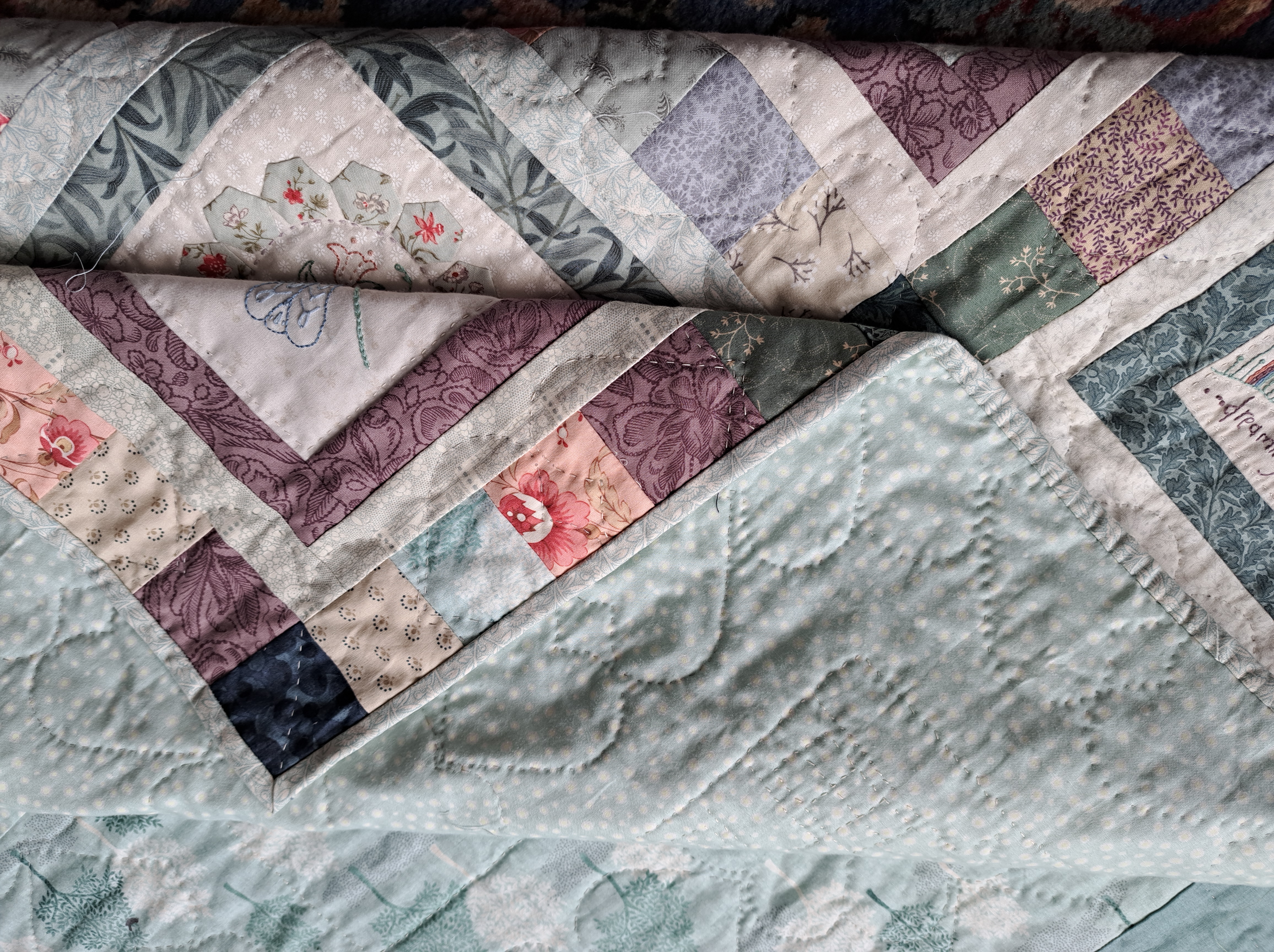 I tried a couple of fabrics for binding, but eventually decided on this grey/blue design which I had used for some of the sashings. I did my usual double fold method with 2.5″ strips. I always hand stitch my binding down, it may take a few evenings in front of the TV but I much prefer the finish.