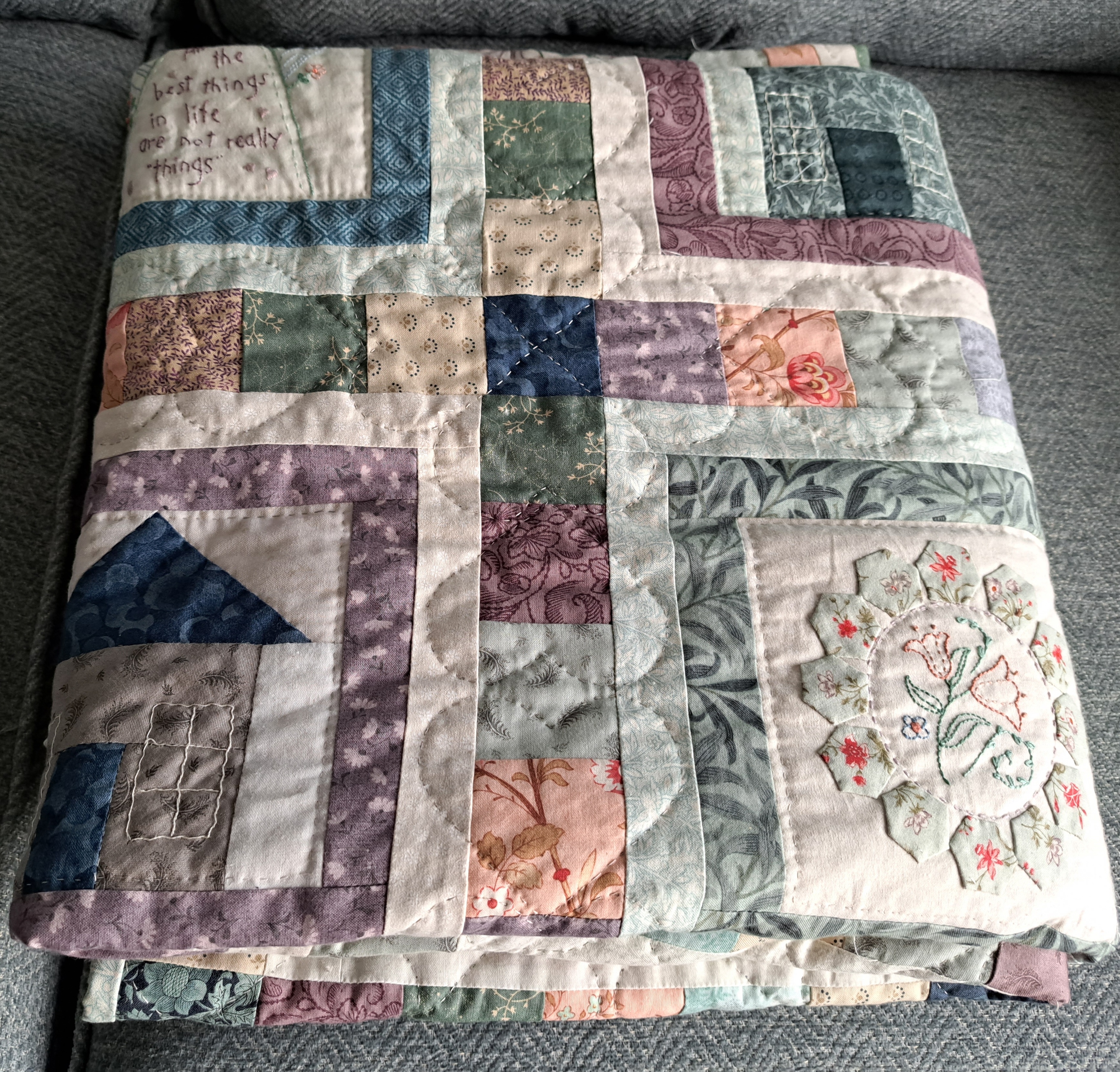 I started this quilt back in 2020, it was one of the wonderful free stitch-a-long patterns the craft community came up with to keep us sane during the long lock-downs. The embroidery patterns were designed by different quilt designers(mainly Australian I think) and the whole project was organised by Natalie Bird of the Birdhouse. I made it from the fabric left over from a quilt called Coming Home, due to the conditions this quilt was started under it was soon called the Staying Home quilt.