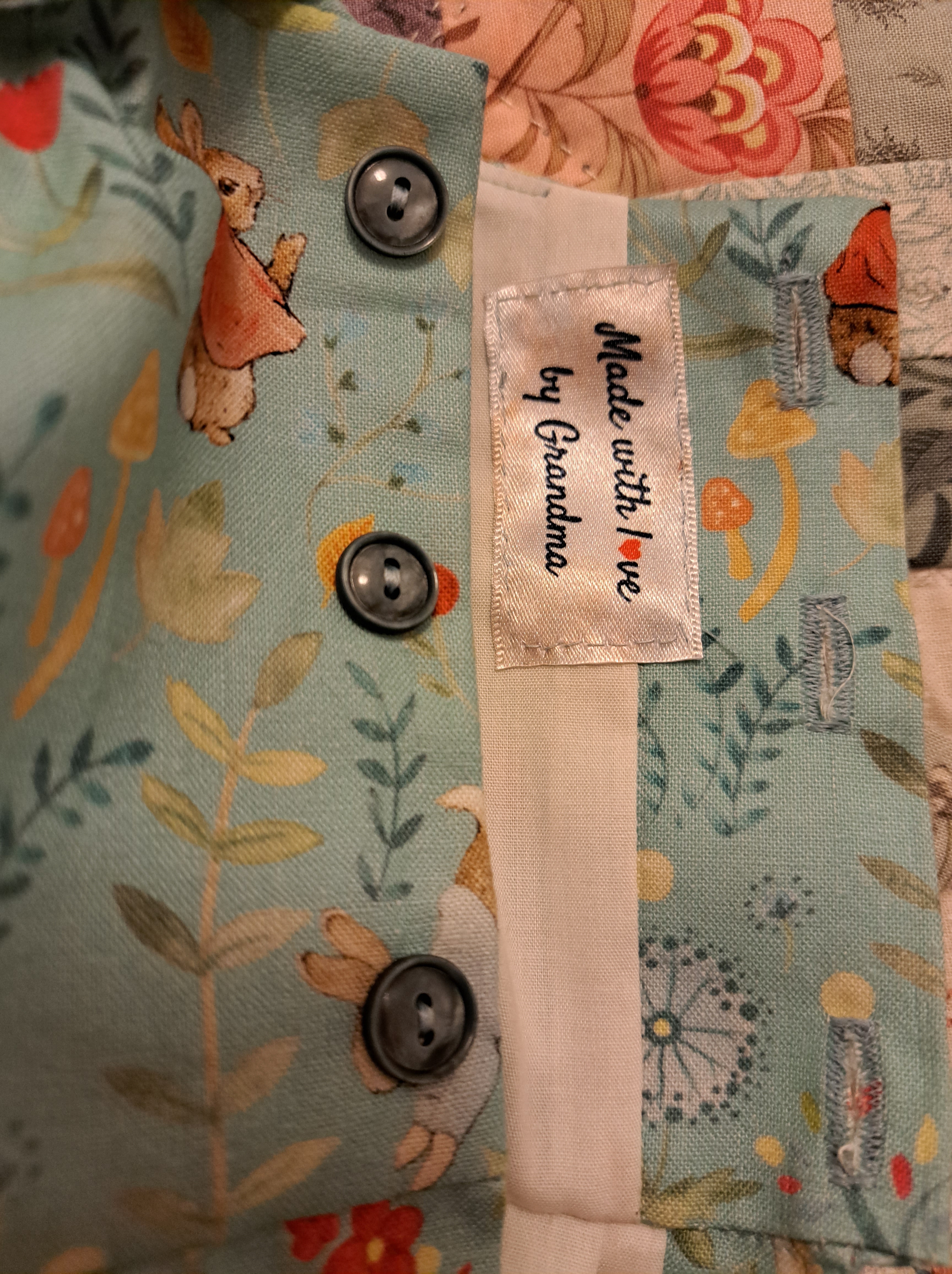 The buttons are less than 1/2″ in diameter, I found them in my stash. I was tempted with some little red ones too but these nicely picked out the colour of the darker leaves. I stitched on a Grandma label. and the rompers were complete.