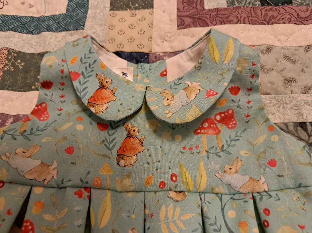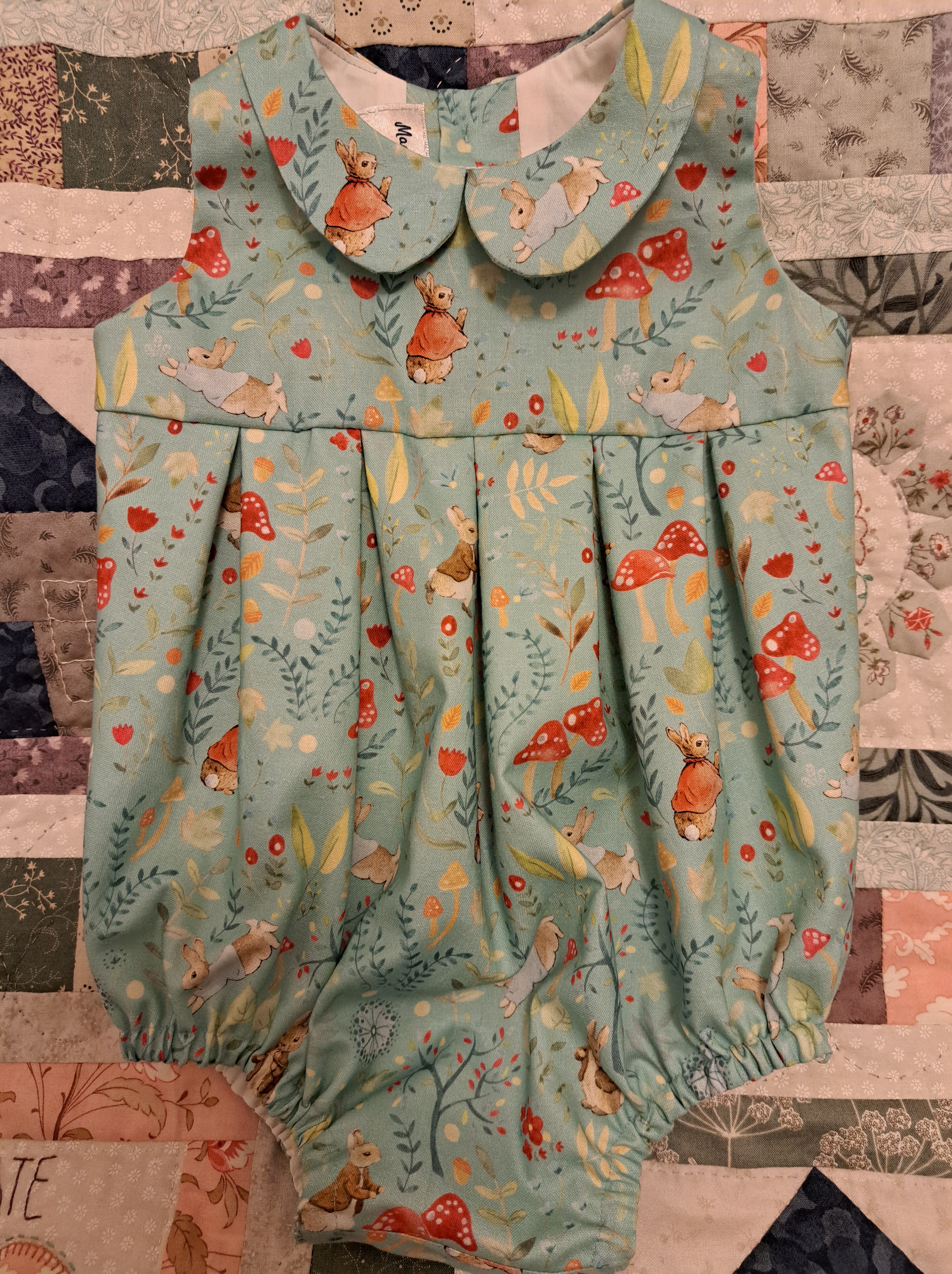 It’s called the Rosa Romper, a little disconcerting as from the blurb it’s obviously aimed at girls, however I decided that with the right fabric and pleats rather than gathers it would be fine. I saw some gorgeous Peter Rabbit fabric on line and ordered a metre. It’s always a risk when buying fabric on line as so much is how it feels, not just the pattern but when this arrived it both looked gorgeous and felt beautiful! It’s organic cotton and whilst it’s a good weight of fabric, it is so soft to handle, perfect for a baby.