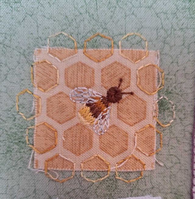 I’m particularly pleased with my bee, I had a fat quarter of honeycomb fabric so I cut a small square and rather than just stitching round I suddenly had the idea to extend the honeycomb pattern onto the background. I then drew a bee using a frixion pen and stitched it. I’ve just realised he’s legless, so I might add a few legs!!