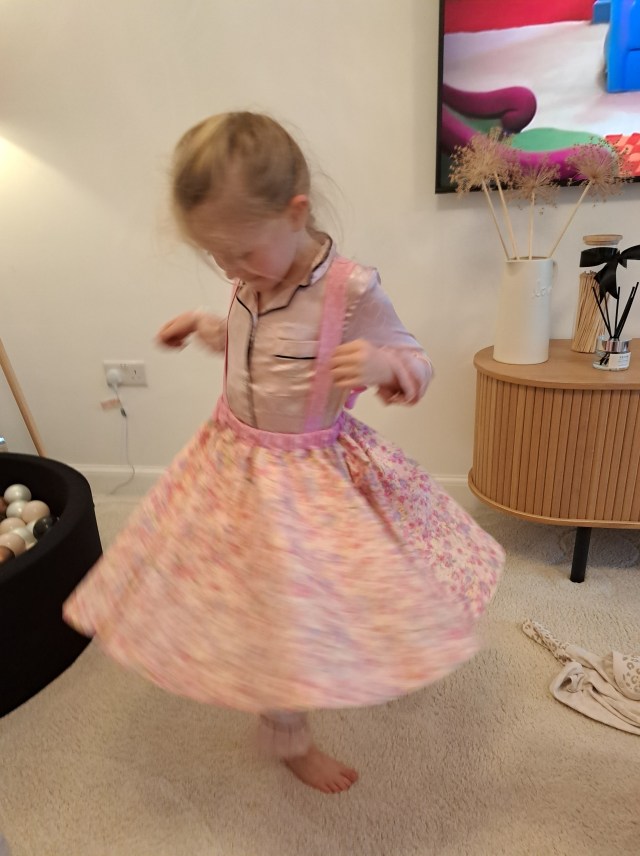 We went round on Wednesday evening and she tried it on immediately over her PJ’s, it’s a little big round the waist so when they get back from holiday I’ll take the elastic in a bit. The straps are detachable too so if she just wants to wear the skirt she can. She loved twirling round the living room in it.