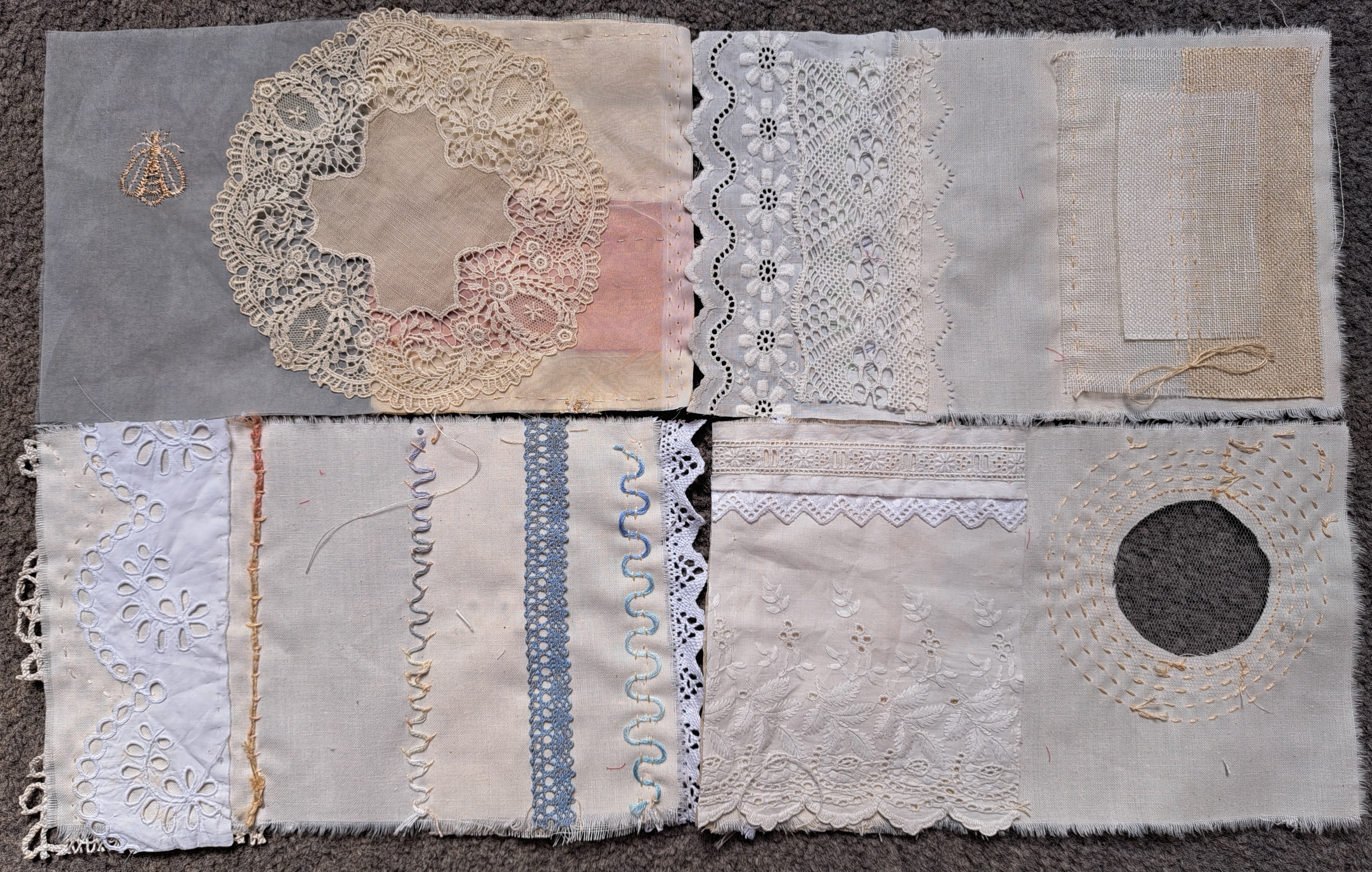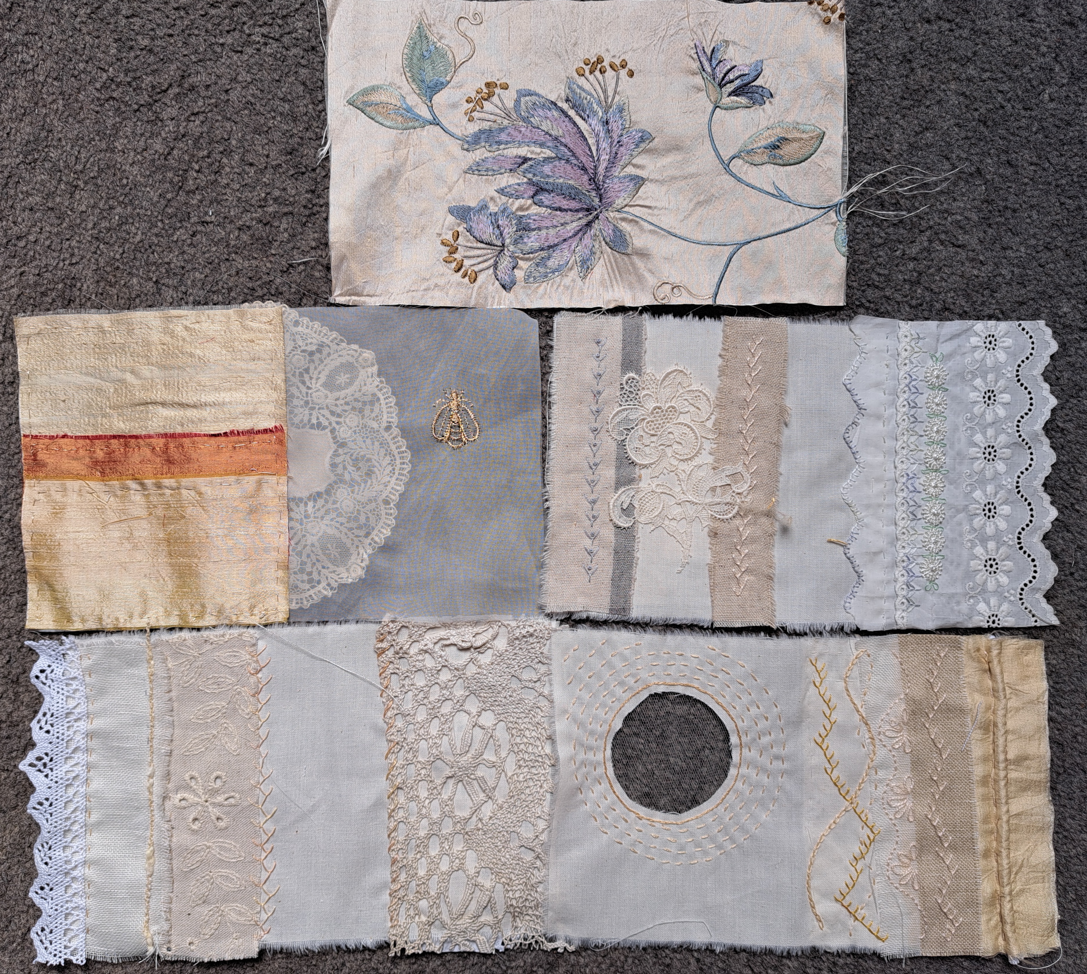The voile backing the gold silk needed something. I tried a few things but eventually came up with this lace doilley. There’s a vintage shop in Otley which has a basket of scraps, damaged textiles etc, it came out of there. Initially I was going to cut it up so it would just be behind the silk, but then I had the idea of centralising it so it makes the bee side pretty too.
