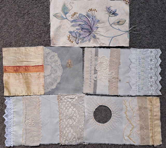 Last week at Skipton Stitchers we had a workshop called Lines and Edges by Deb Cooper, I really wasn’t sure what to expect but I loved it. I think sometimes having no expectations helps as you start with an open mind. All we had to take was a basic sewing kit, some calico as a base fabric and any scraps of fabric, lace, threads we had to hand, ideally natural fabrics such as cotton, linen, silk etc. I had a rummage around in my sewing room, rescued stuff from the charity pile (isn’t it always the way!!) and went along with a bag of goodies.