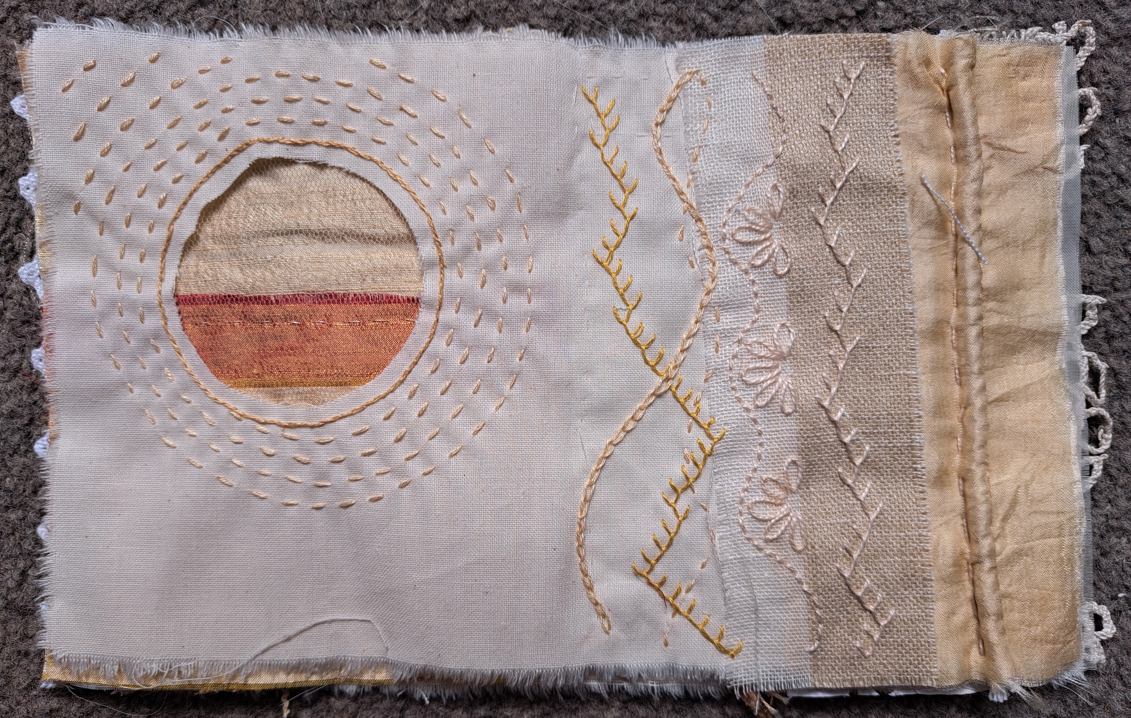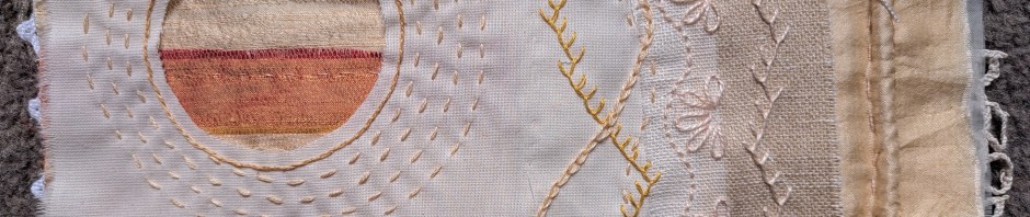 Sometimes my stitching doesn’t go quite according to plan and I have to think outside the box a bit, the other half of the ‘window’ page is a good example…the beige linen with the feather stitch on ended up decidedly slanted, I’d stitched too much to undo it, so I did lots of wavy lines instead so it’s hopefully not quite so obvious. The gold silk next to it has a length of piping cord in it, I’m having second thoughts about it at the moment as the book is going to be eco-dyed as a whole, flattened and bound tightly, I’m a little concerned that having the prominent piping will affect the pressure of the binding, it won’t be even…I’m still mulling that one over!