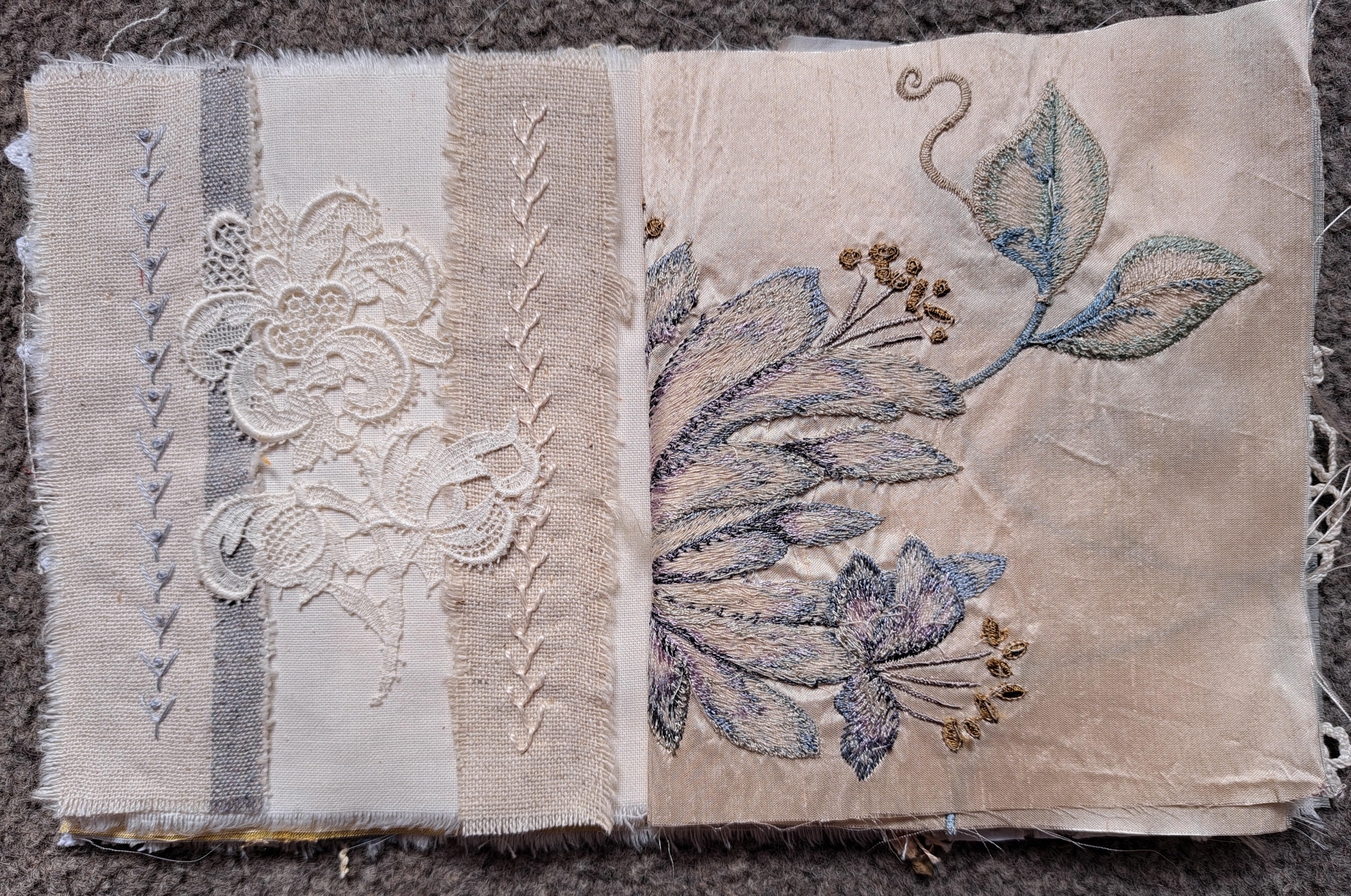 The page with the gold silk strips is designed as the view through the ‘window’, I needed something to mount it on so I used some voile with gold embroidered bees on which I bought probably about 30 years ago in Helmsley! The top piece is from a curtain sample book, it’s just very pretty silk which was too nice to cut smaller so that’s going to be the centre page.