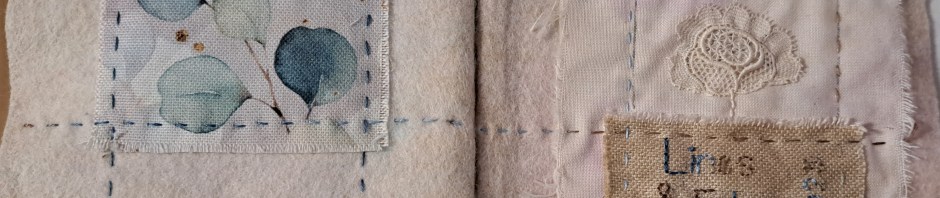 The book needed a pretty cover. I’d used some ivory 100% wool felt for the cover when I was stitching the whole book together, this had dyed to a nice warm oatmeal. When I was binding up my book I’d included some scraps of linens and cotton with the idea of maybe using some of it on the cover. I played for ages until I was happy with my arrangement. I embroidered the name of the workshop onto a piece of coarse linen with some variegated thread which nicely picked up colours in the book. I frayed a square of cotton before stitching them onto the felt with simple running stitch, continuing the lines across the cover. The back has a square of eucalyptus fabric so I ended up with a nice criss-cross of lines. The centre needed a little something so I found a tiny scrap of lace which just nicely filled the space.