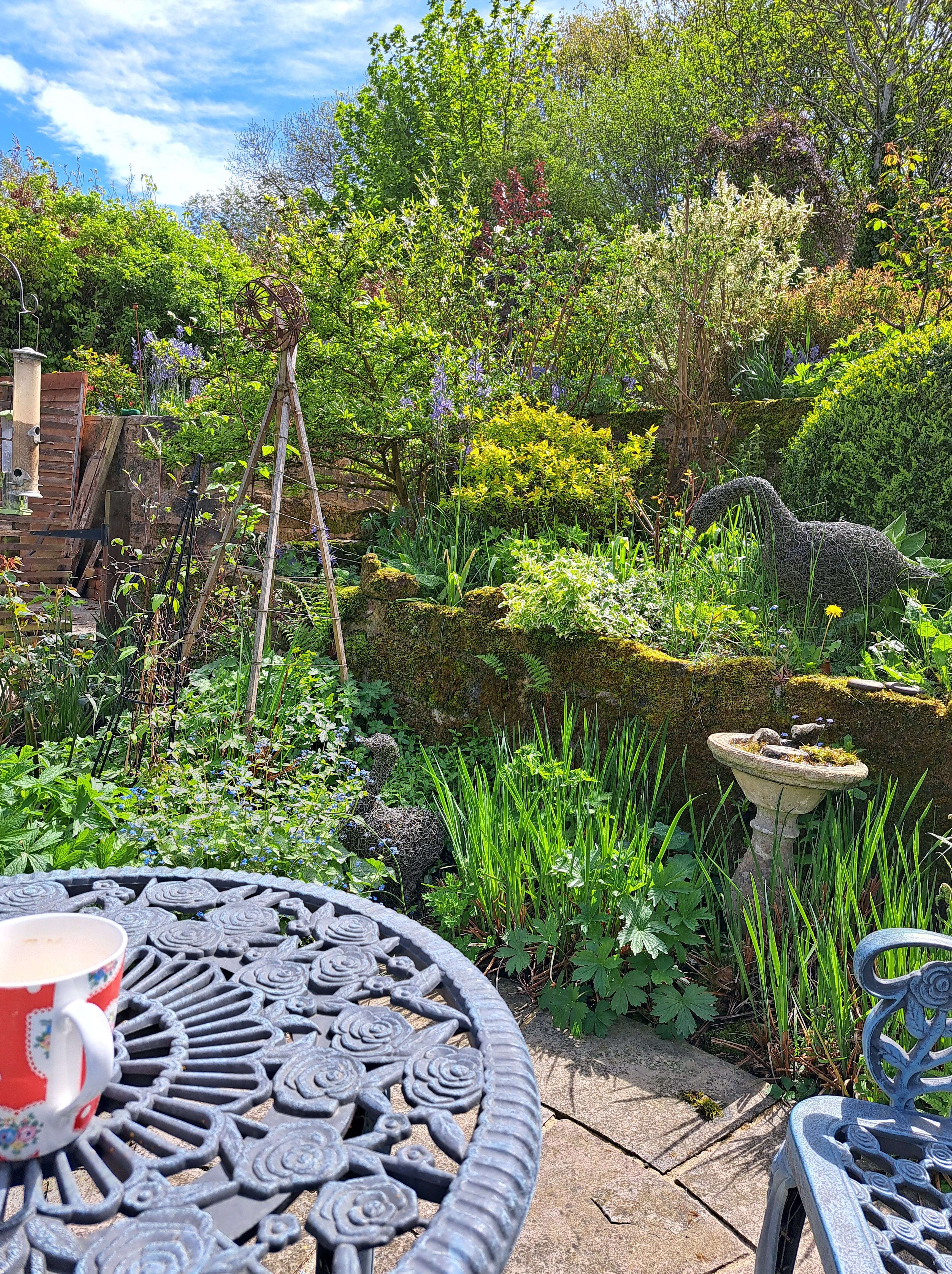 Yesterday it was raining heavily nearly all day, definitely not the weather for meandering round the garden! Today it was warm and sunny so I sat outside for my morning cup of coffee…