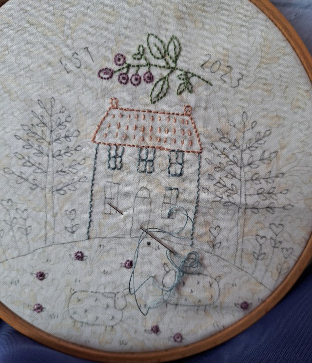 Your second block is just as lovely! I love the blue stitch you used on the sides of the house…it looks like a lovely backstitch, but seems “wiggly”. It’s very pretty and adds texture to the design.