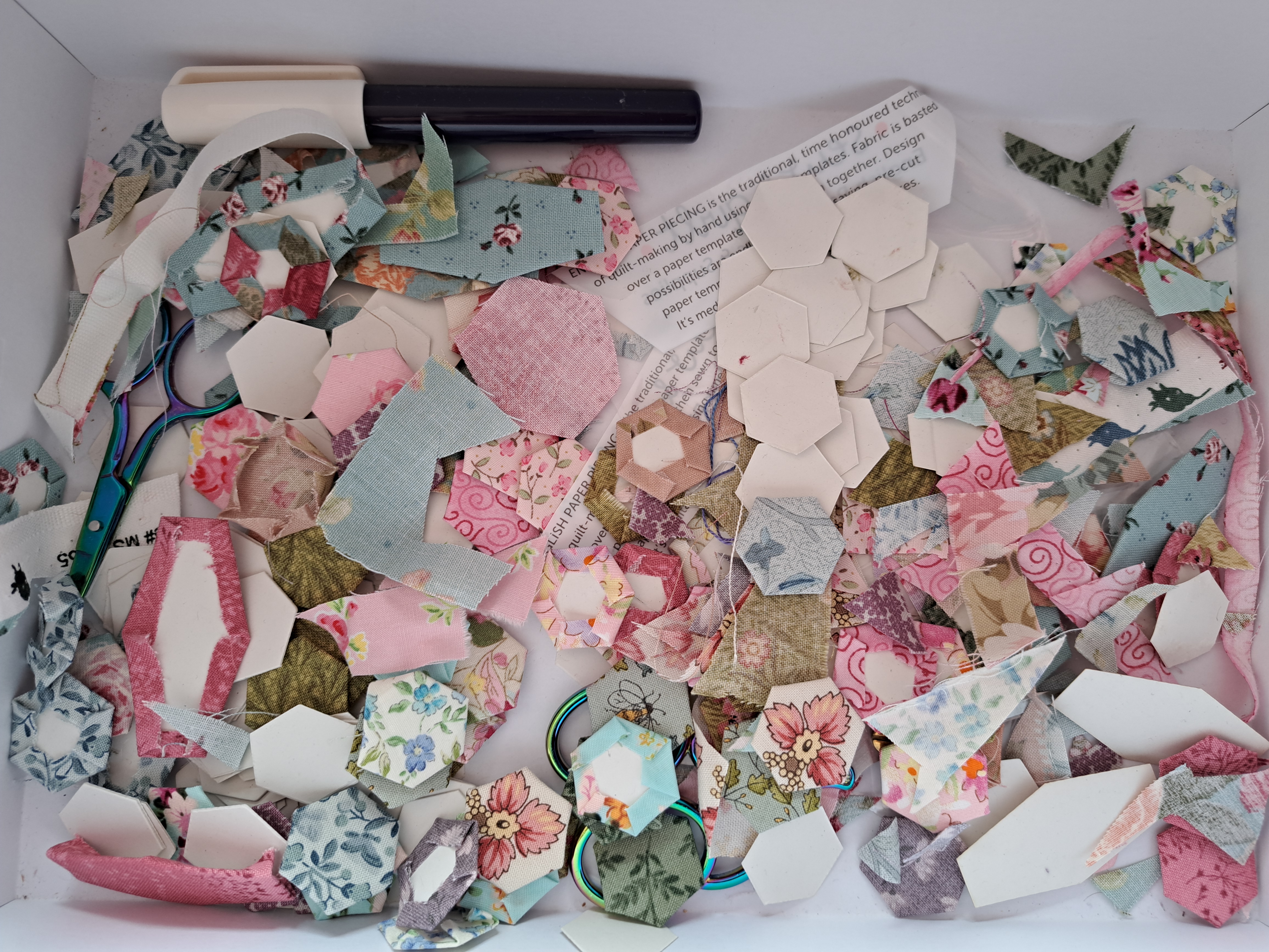 These embroideries have 1/2″ hexagons all round the edge and there’s quite a few embroidered blocks, so whilst watching the coronation last weekend I set up a tray and a little production line for mini hexies. I made half a dozen or so from each fabric and also made some coffin blocks which are for the other blocks in this month’s magasine. I’d bought the pre-cut papers for the quilt, definitely a wise move! The fabric is then glued round the paper template with as little glue as possible, it’s fabric glue which washes out.