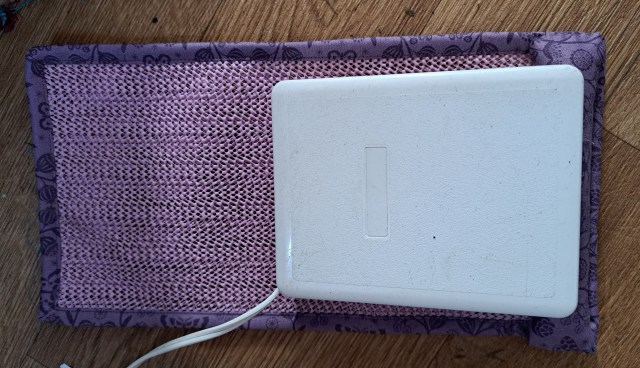 I decided to google non slip mats for sewing machine pedals, and yes you can buy them, but I also found a free pattern on the So Sew Easy website. The design uses the non-stick matting you can get for kitchen shelves and that sort of thing. I popped into a general hardware shop in Otley to see if they had any. The assistant was very apologetic that they only had pink or purple…purple is perfect, I said, it’s for my purple sewing room!