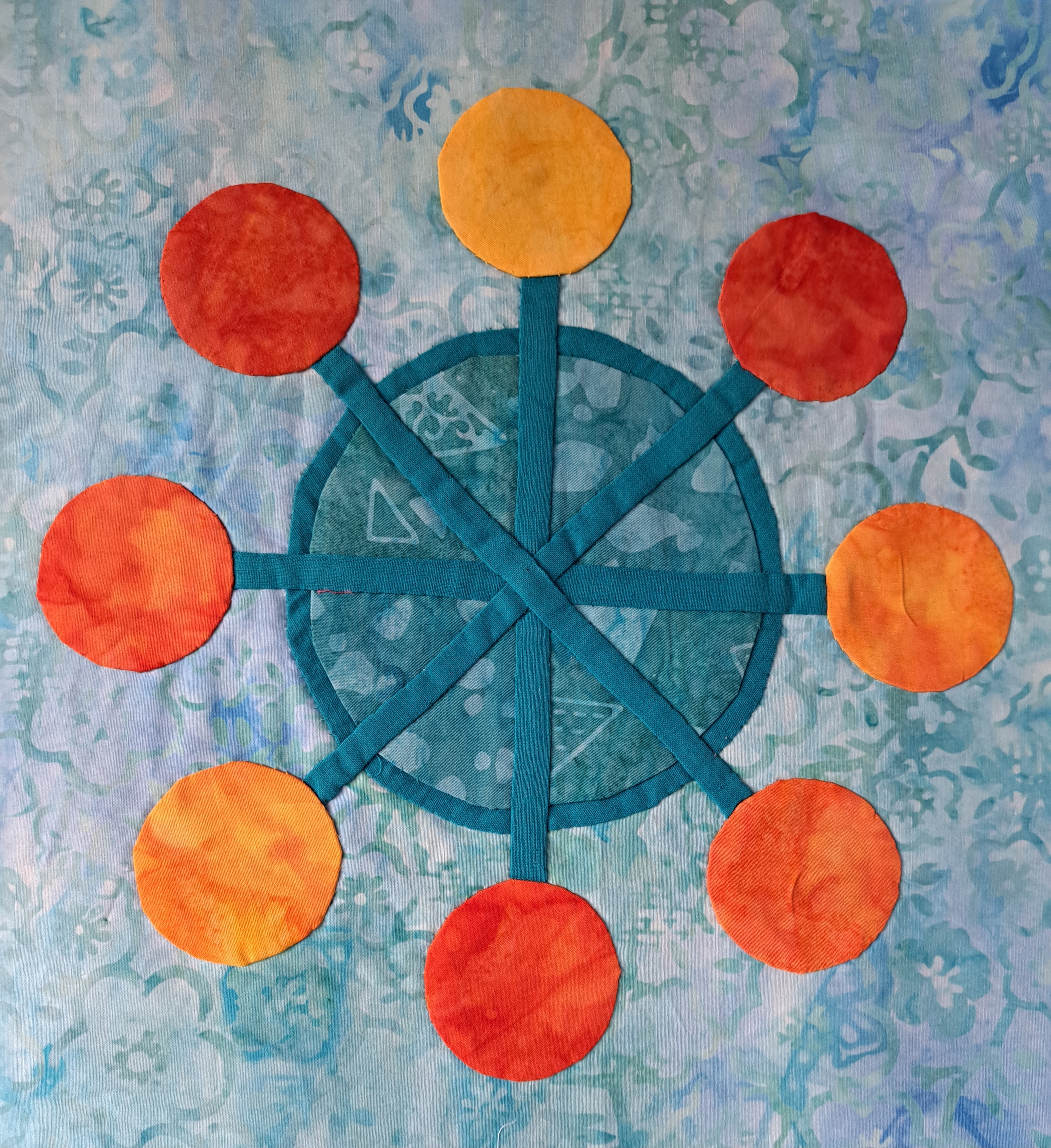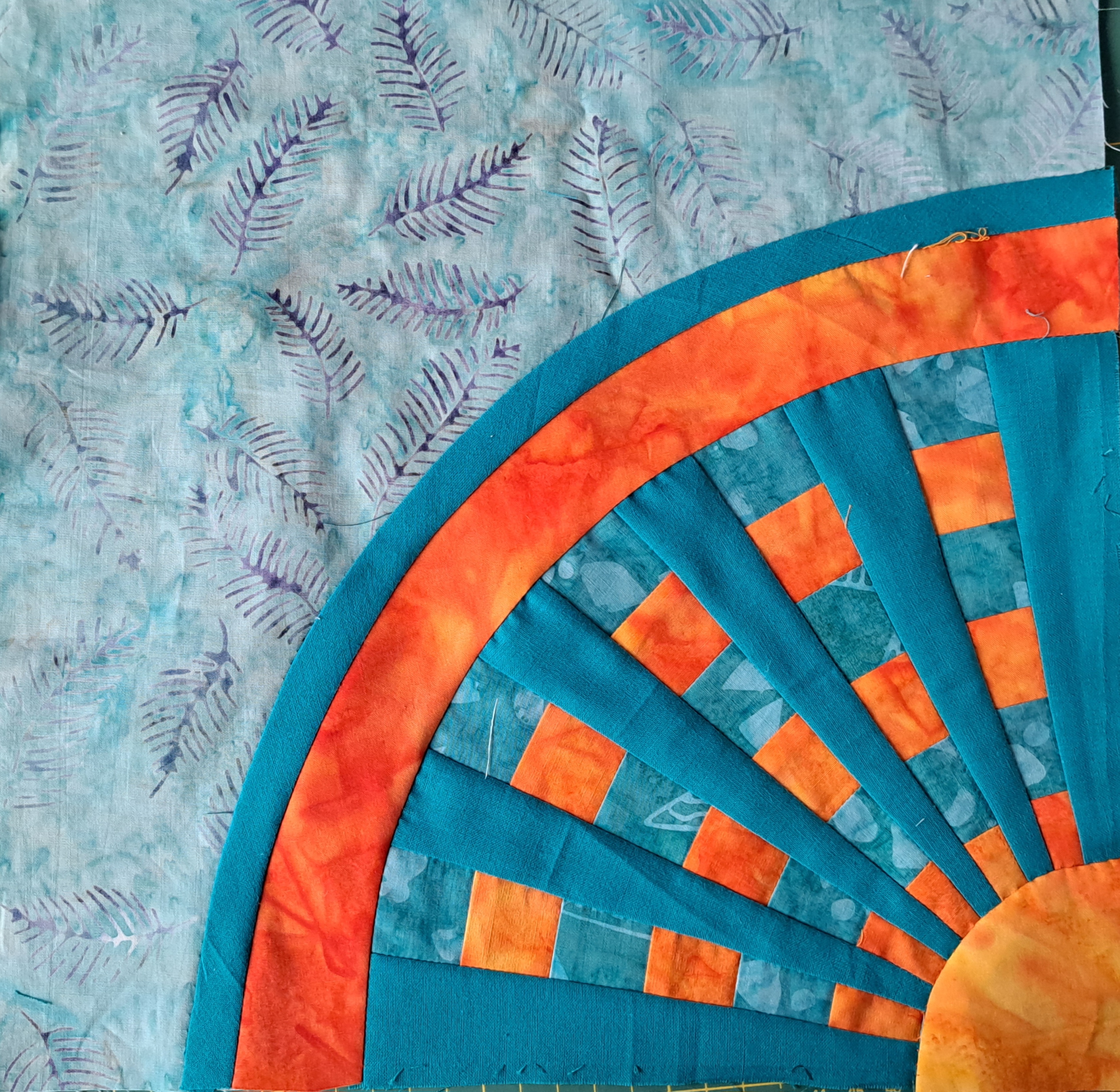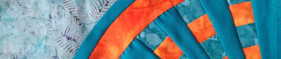 At one stage during the making of the block I did wonder about making prairie points round the circle, but I decided it would mess up Kate’s quilting and when I tried a few triangles around the edge, planning to stitch them down, it actually looked a bit much. Instead I stitched the wide orange border, I felt very brave (or reckless!) at the time as I cut it out as an arc and then stitched it on the machine, stitching curved seams on quilts is usually enough to send me into a panic so I was relived when it all fitted OK first time. The bias teal strip was also stitched initially on the machine and then hand stitched to the background.