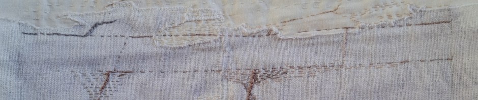 So this is the finished piece, photographed on a hotel bed, I’d removed the Frixion pen with a hairdryer but I didn’t have access to an iron to give it a good press. I was pretty pleased with it in the end. It looks quite purple but then so does the photo, so I’m just hoping it looks OK with it’s neighbours. It was also hard to get the tonal values right, some of my lines and shadows look a little dark but they were actually stitched in pretty light shades, much lighter and they didn’t show up at all. Here’s a closer photo of the actual piece…