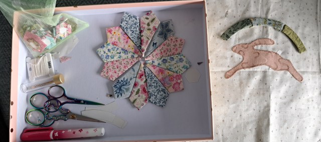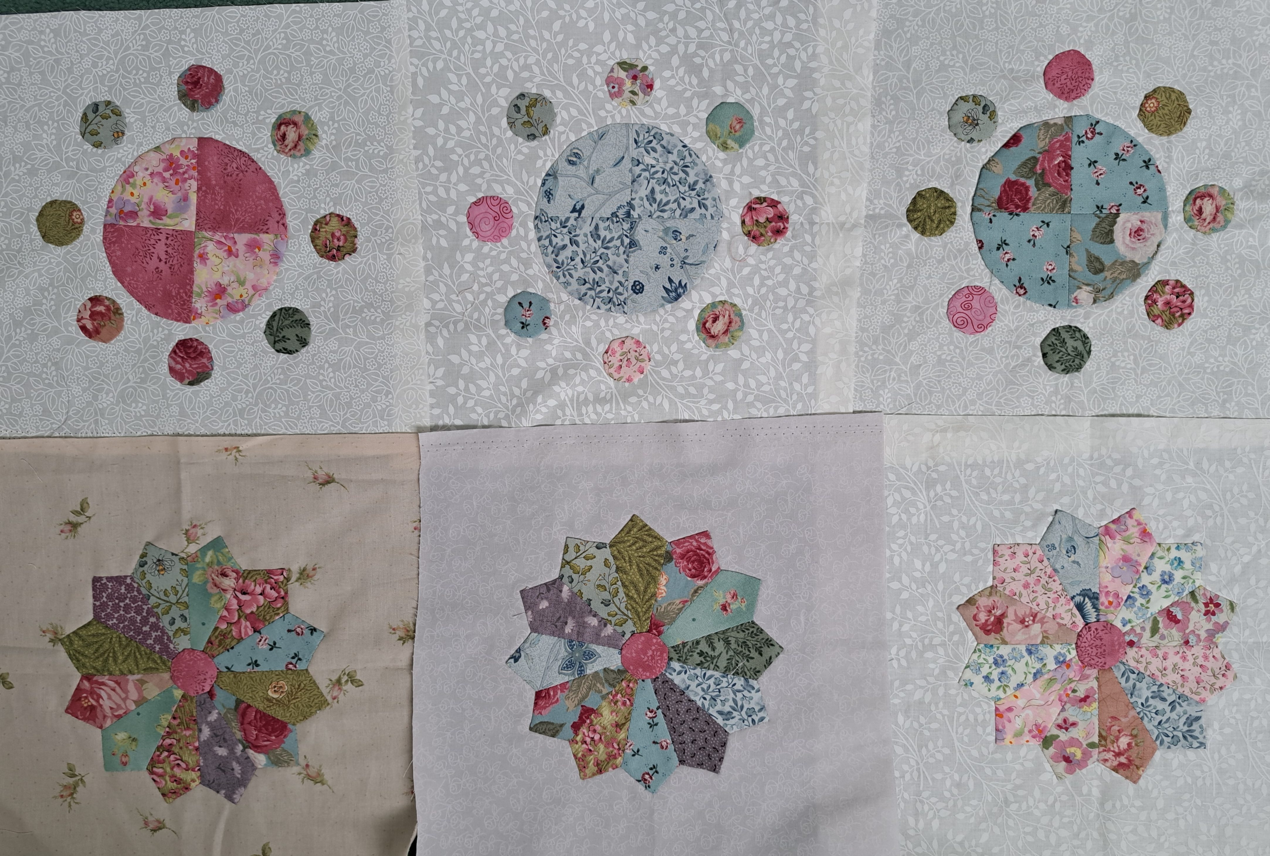 I also made inroads into the next magazine’s blocks. I made three penny circle blocks first, though my 1″ circles look more like dodecagons! I then started the Dresden plate blocks, I like these, I’m beginning to think I’m more of a straight line quilter!! They’re easy to get nice and neat! I’m also a convert to the stick and stitch method of English Paper Piecing, using a light fabric glue to baste the fabric round the shapes, though the next block might prove a bit more of a challenge…