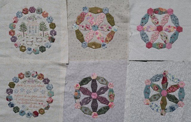 I love the embroidery blocks with the hexies around… such a beautiful project!