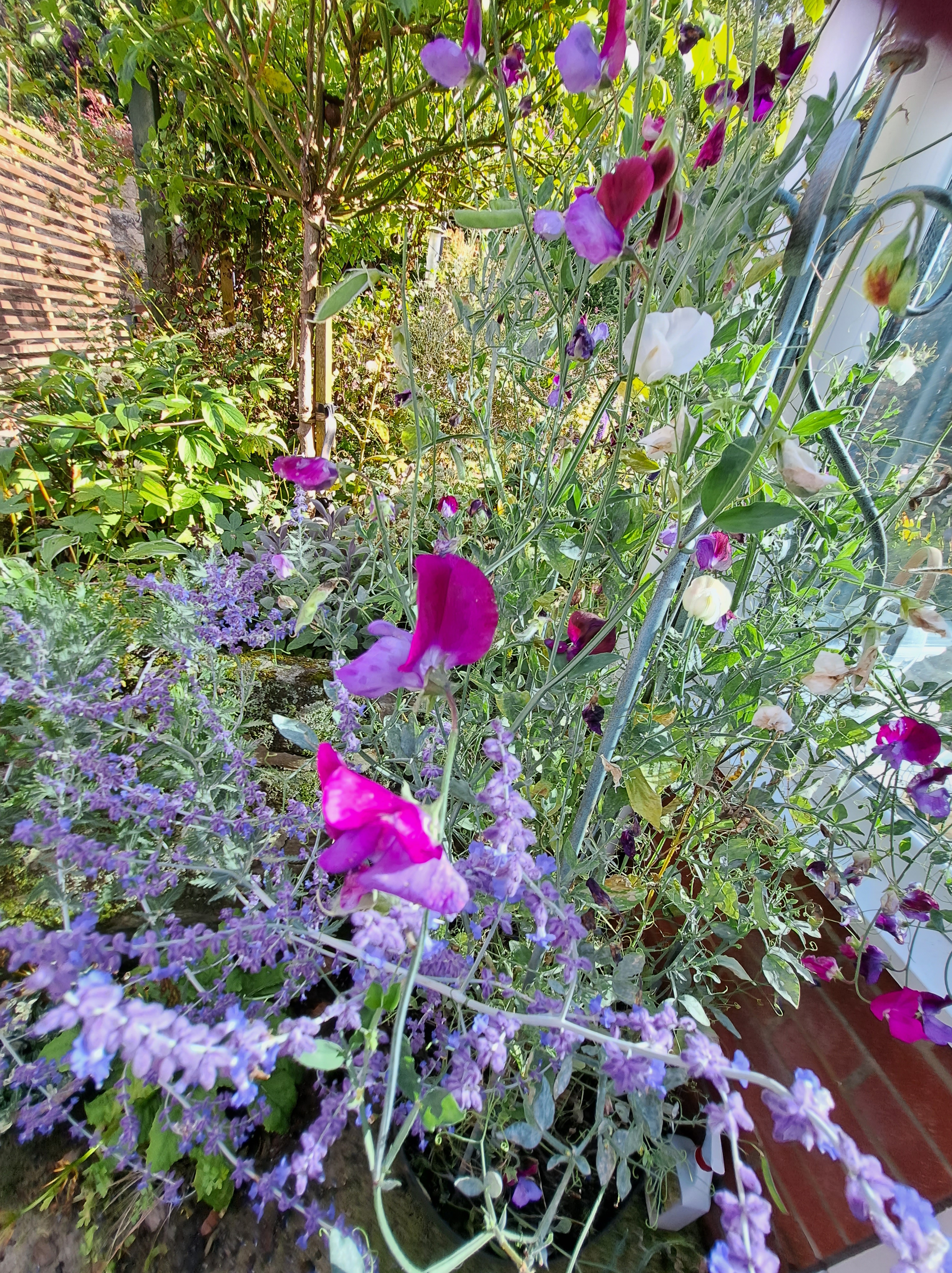 This year I’ve finally had some success with sweet peas. I started them off inside and transplanted them into their final big planter whilst they were still living in the conservatory. I found a really pretty and well designed stand for them which stores flat but folds out into three sides for them to climb up. They look particularly pretty next to the perovskia which for some reason is insisting on growing sideways instead of up! I really need to cut off those pea pods or they will stop flowering.