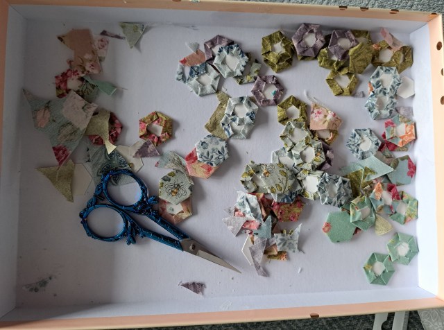I’ve spent a couple of hours making lots of hexies, rather than making what I need for each block I’ve made half a dozen of each fabric, so they’ll last me a few blocks. There doesn’t look so many in my box lid but that’s about ten different fabrics, so about sixty hexies…