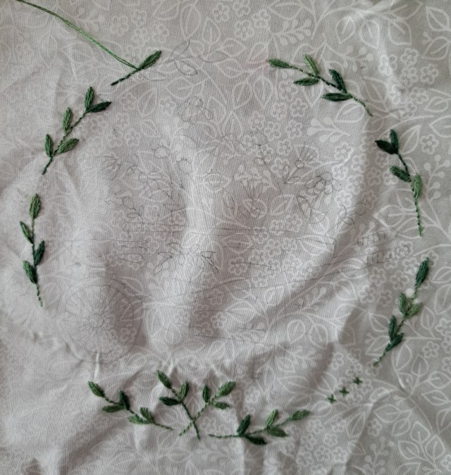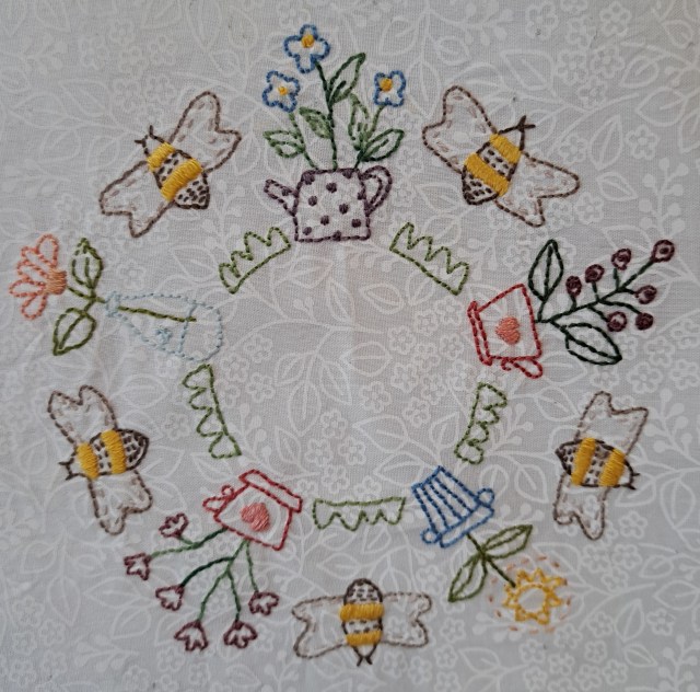 I’ve also started another embroidered block, this is my handbag sewing, so it’ll take a little while. I’ve almost stitched the leafy border, then there’s a wheelbarrow full of flowers in the middle.