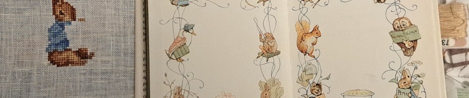 I think it’s a particularly cute design as it’s based on the frontispieces of the Beatrix Potter books which have six of the characters reading books. I like the pulled thread detail too.
