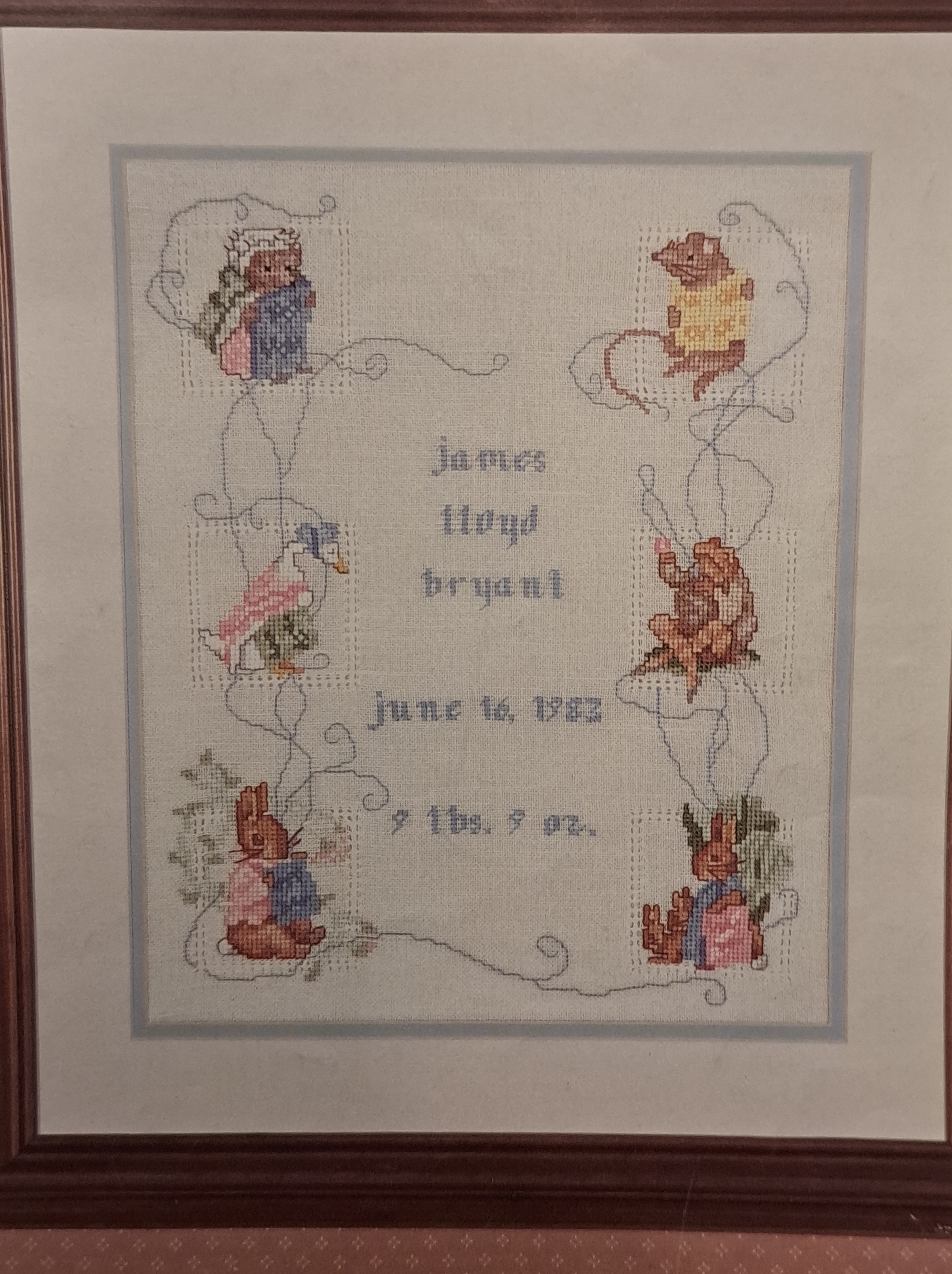 I’m stitching a birth sampler for my grandson for Christmas. I usually stitch a non-baby design as otherwise I think they can have a pretty short shelf life, however they always seem to stay with the parents when the children move out anyway! These are the two I did for my children…