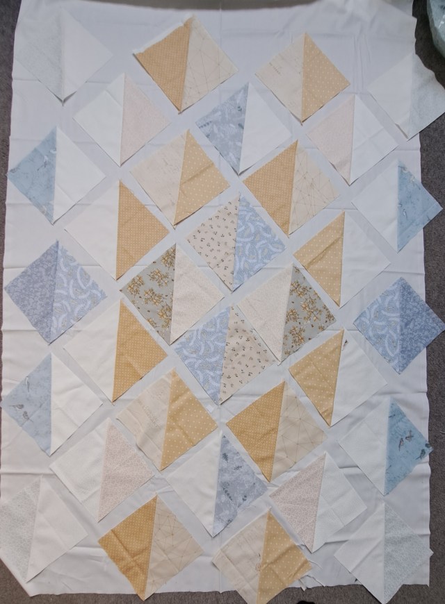 The original pattern used 5″ squares as the original block. I wanted the quilt to be throw size so after lots of calculations on the size of squares on point, I cut 8″ squares to make 7.5″ half square triangle blocks. I made lots of half square triangles, some of which got abandoned pretty early on. I’ve got a bit of a heart theme with fabrics and I have a lovely old gold fabric with ‘threaded with love’ printed on it, but it was too dark. I also got the white version of a hearts one I have used in pale gold, silver and and copper colourways, but that was too white against the warm white I used for sashing. This was my first layout…
