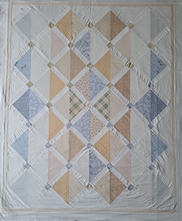 I trimmed the quilt and added a narrow pale gold border and a wider white one and the quilt top was finished. Here it is all neatly sandwiched on the floor…