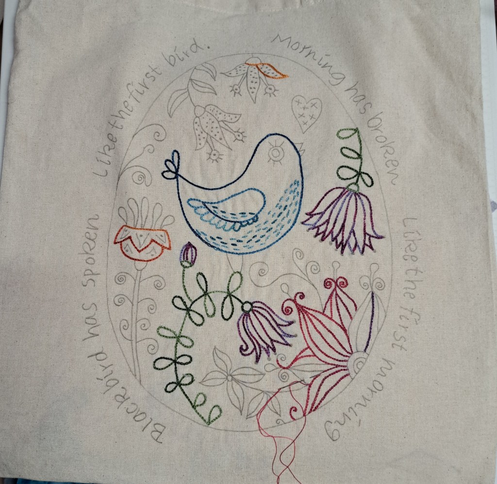 I bought this tote bag at the Harrogate Knitting and Stitching Show, it is made by the same people who designed the sewing box, Sew Enchanting. I think they had two or three designs to choose from. There’s no kit, just a bag with a design printed on for you to embroider. It was quite useful on holiday as initially I used it as a bag to carry my sewing stuff in, then once I finished the first embroidery I started this one.
