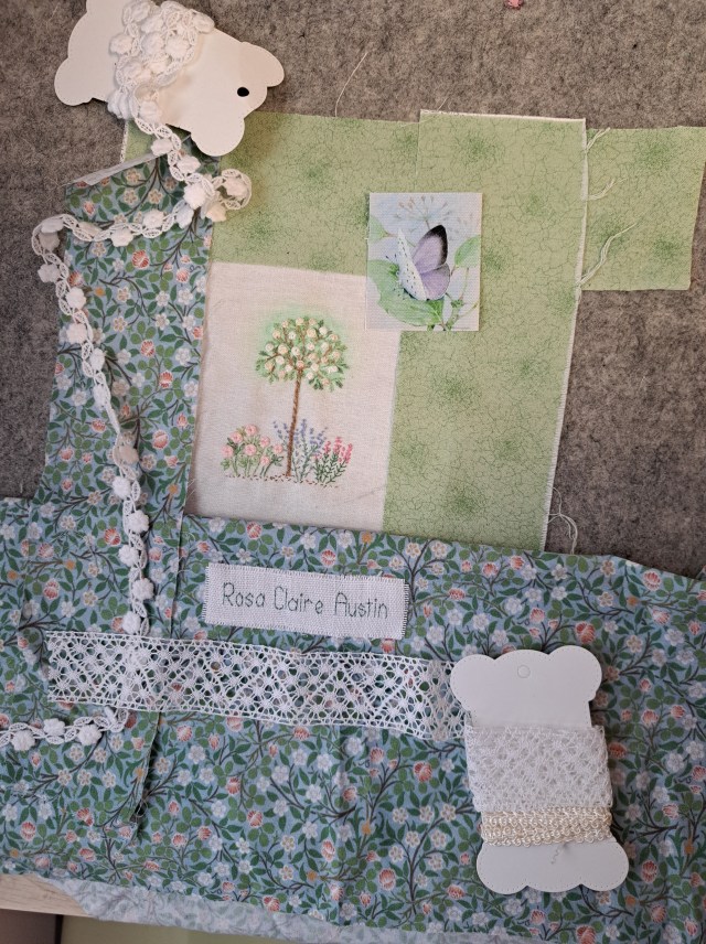 In the meantime I found I’ve still a few mini embroideries to incorporate into a page or two. I decided to do the one of my standard rose, Claire Austin. It’s a beautiful creamy coloured David Austin rose, I’ve just looked through my photos on here and I couldn’t find a single photo! Very remiss of me as it’s a beautiful standard rose, it’s probably because photographically the background is the garage and the kitchen window, not exactly photogenic!! It was the first standard rose I bought, it’s pretty big now. Anyway, here’s my embroidery together with a few bits I pulled out to have a play with.
