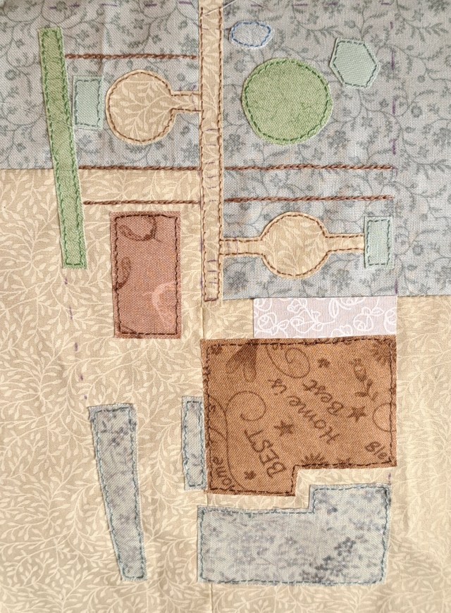 It took me a while to work out how I was going to create this piece, I wanted it to be fairly clear and not too labour intensive. I decided on a four-patch pieced backing with applique shapes applied using bondaweb. Once I’ve finished the embroidery I’ll cut it out and mount it on a plain fabric page. This is where I’m at so far…