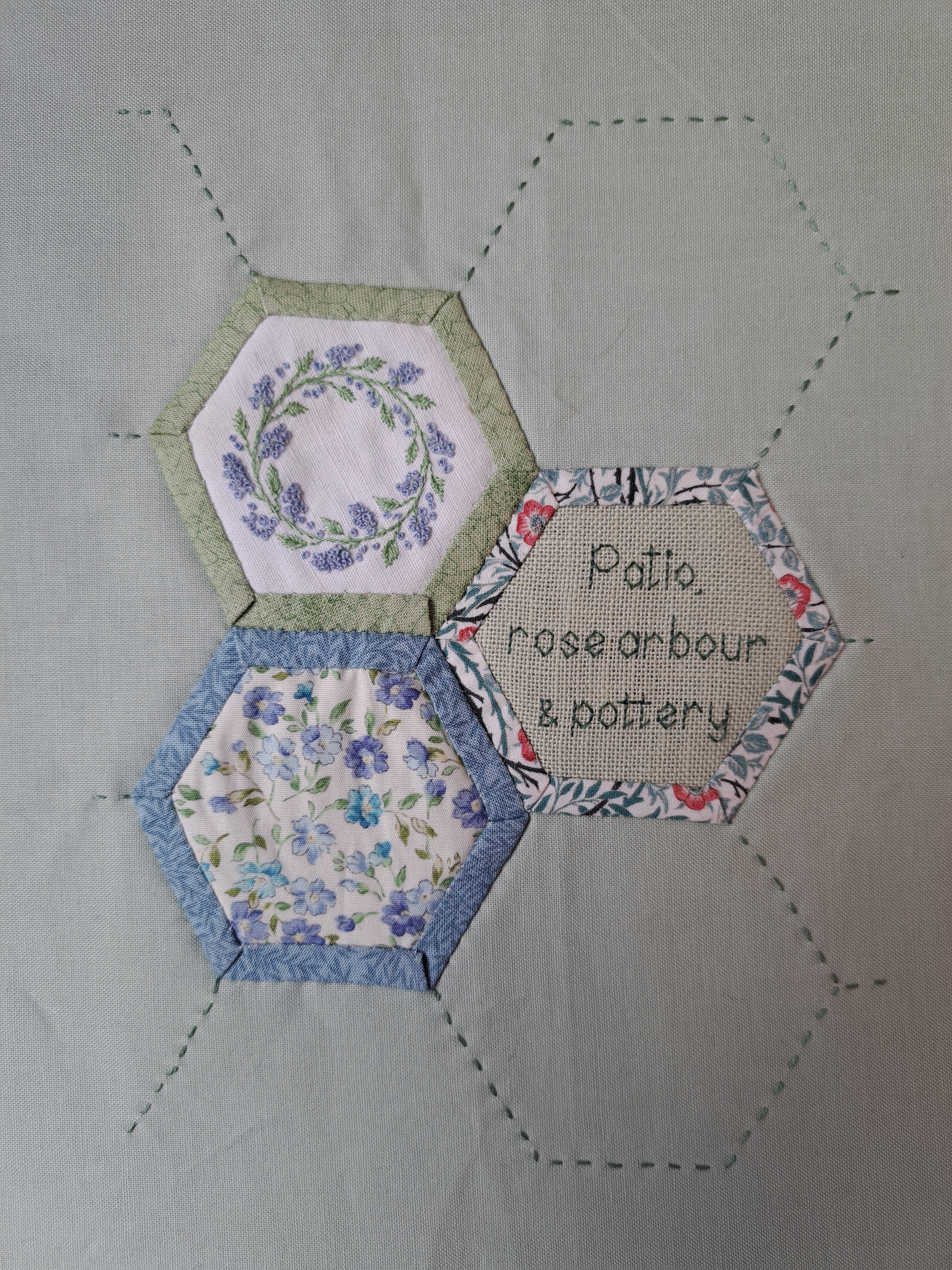 Three weeks ago I was just starting the one for the summerhouse and pond area, using up all the leftover hexies from my Owl and Hare Hollow quilt, still trying to decide on the background fabric…