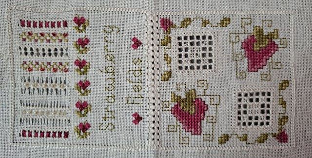 I’ve been working on my strawberry sampler book for about an hour most evenings and I’ve now finished the last two pages. I think this one just needed the edge stitching after I last shared it with you. This is the hem-stitch page.