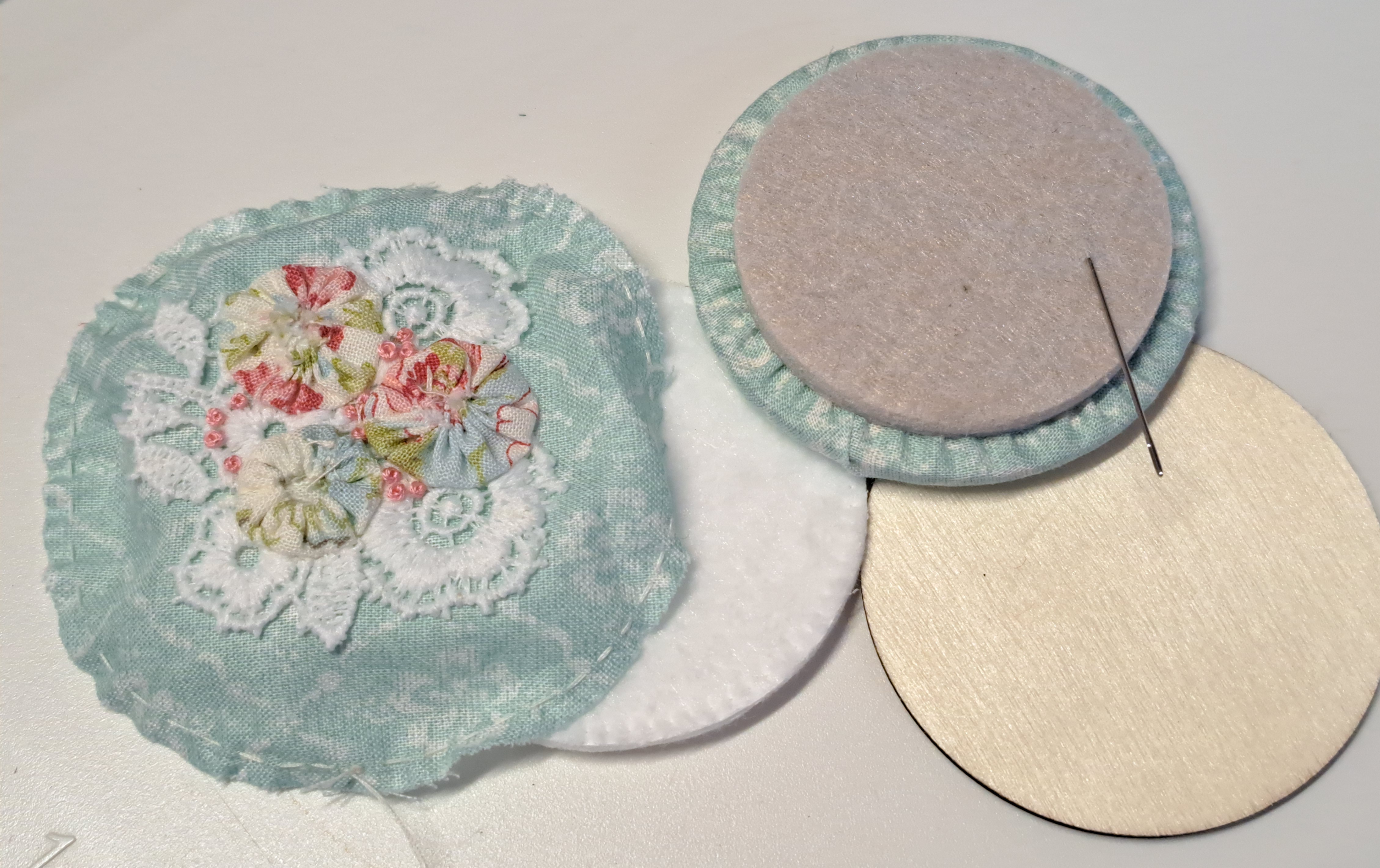 She provided us with two large circles of cotton, three little ones to make Suffolk puffs with, a piece of lace, some buttons, two make-up pads, two circles of wood and a thick foam pad which was actually the circles you can buy to put on the bottom of furniture.