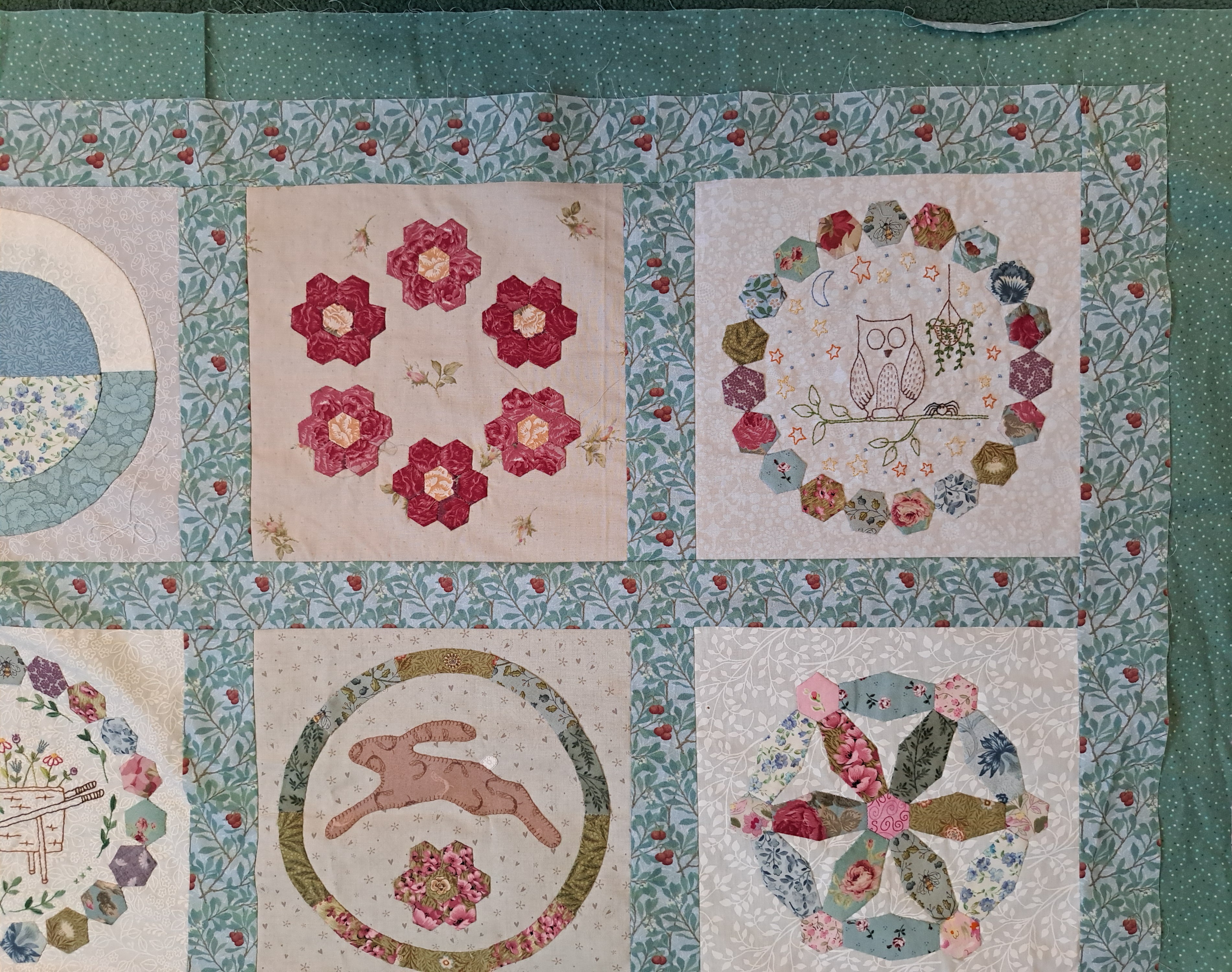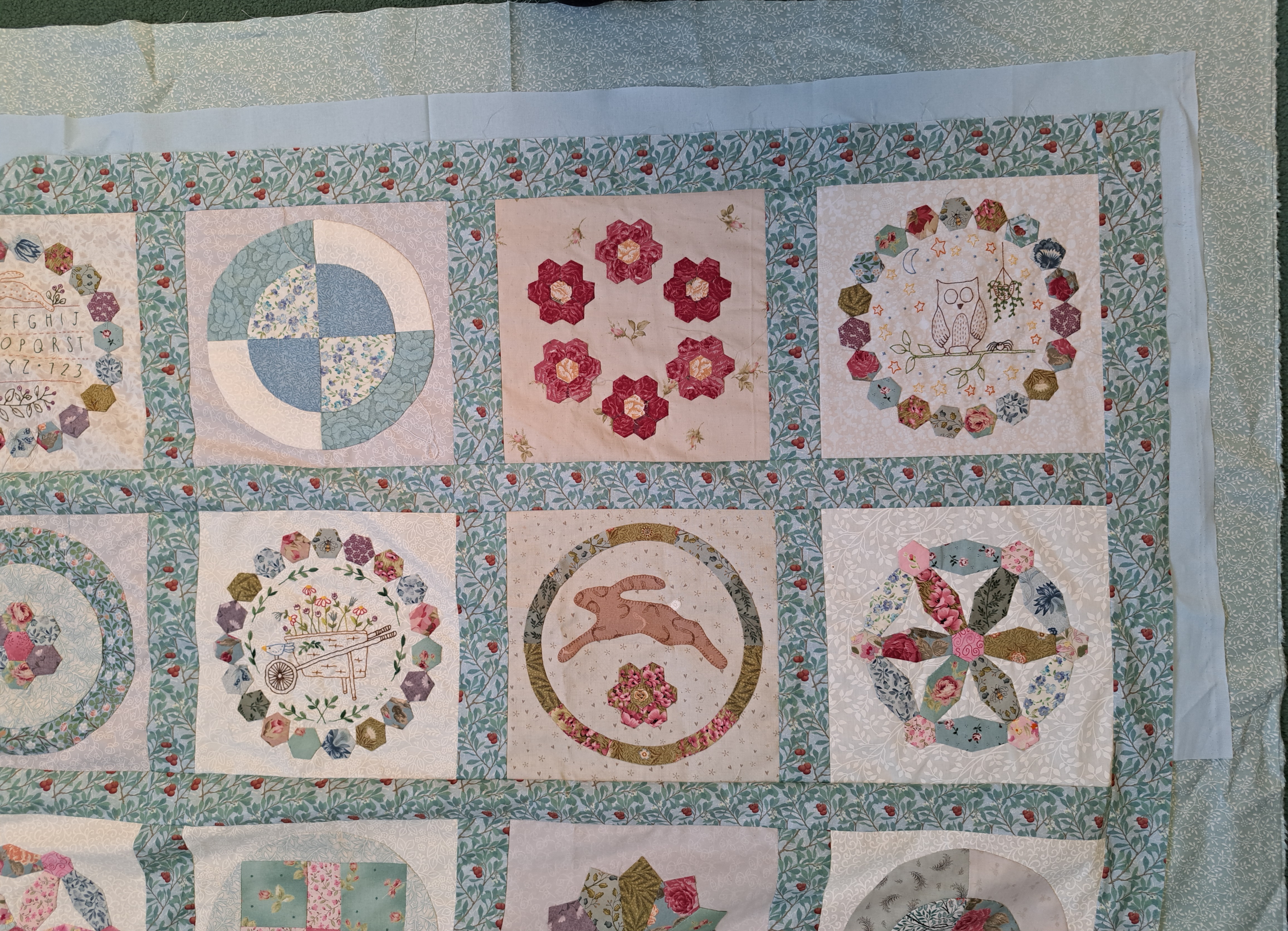 I popped into B&M fabrics in Leeds last week and picked up a couple which I thought would work, I’d taken a strip of the sashing fabric with me, there’s a plain light blue which does perfectly pick up the background of the sashing, I do quite like that for a narrow inner border. I also chose a patterned green which I thought matched, but after getting it home, I don’t think it is dark enough…