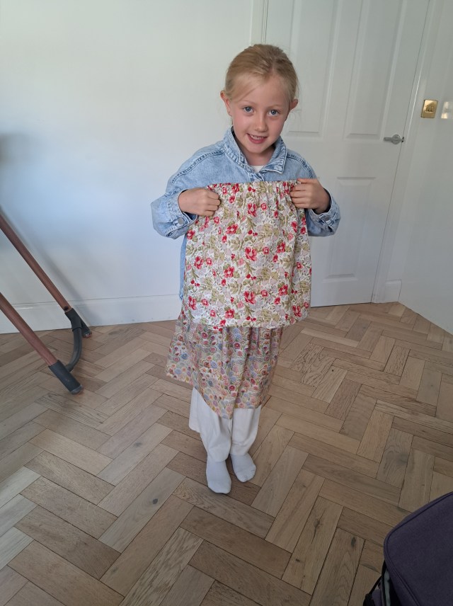 After making her skirt we still had plenty of time so she made a second one! Here she is with her two skirts, looking rightly pleased with herself! She tried them om over her trousers but I’m sure you get the idea.