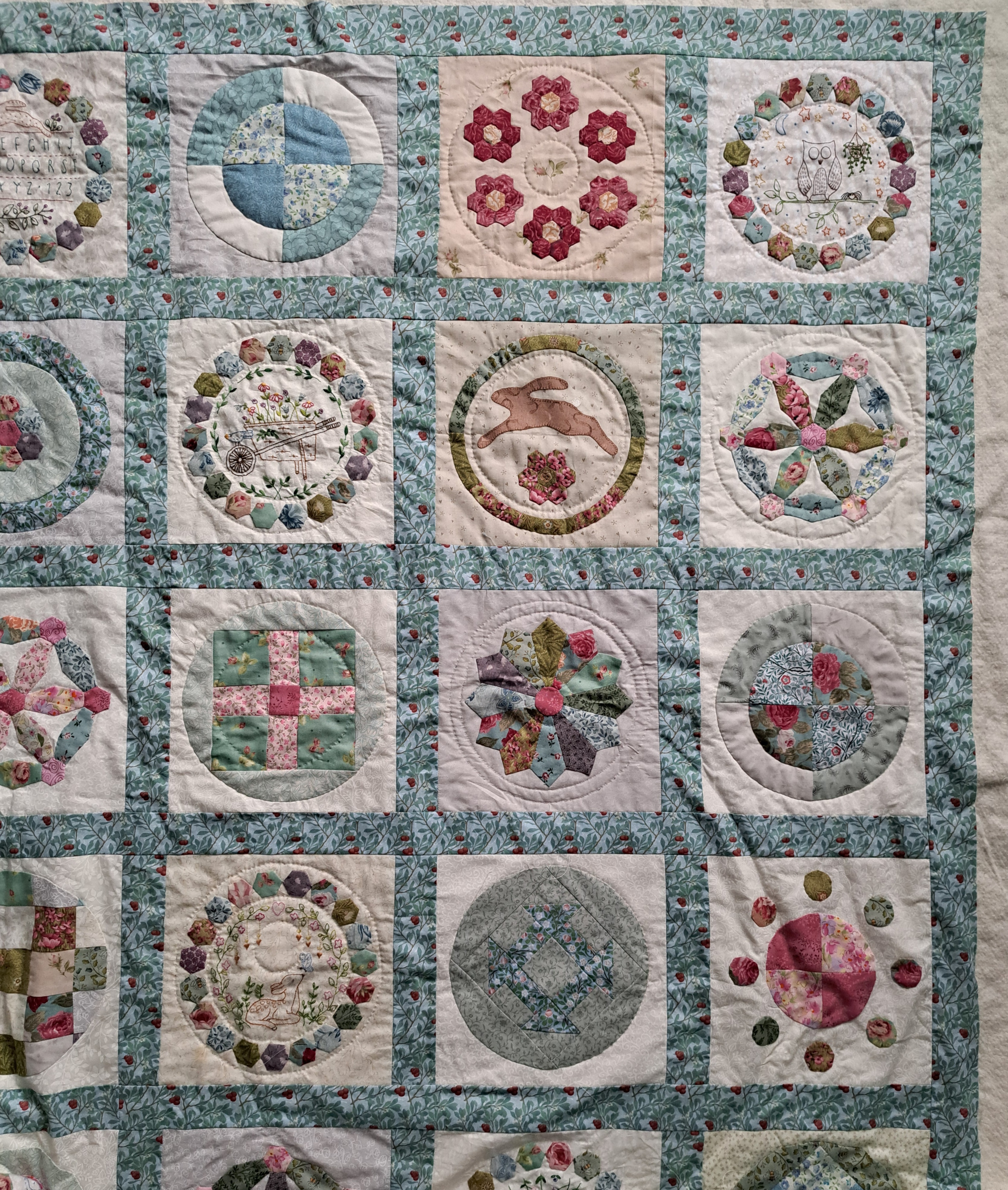 So I’m stitching my 13th block out of 49, probably nearly a quarter of the way through as I’ve still four of the larger circles to do.