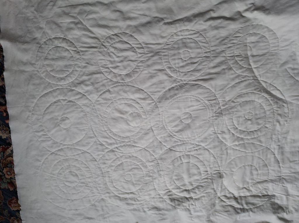 I’ve since started stitching the larger circles that overlap in the sashing. I’ve made a cardboard template to draw around and I’m using a variegated grey thread rather than the cream of the block quilting. It blends in better on the front but makes a subtle change on the back.