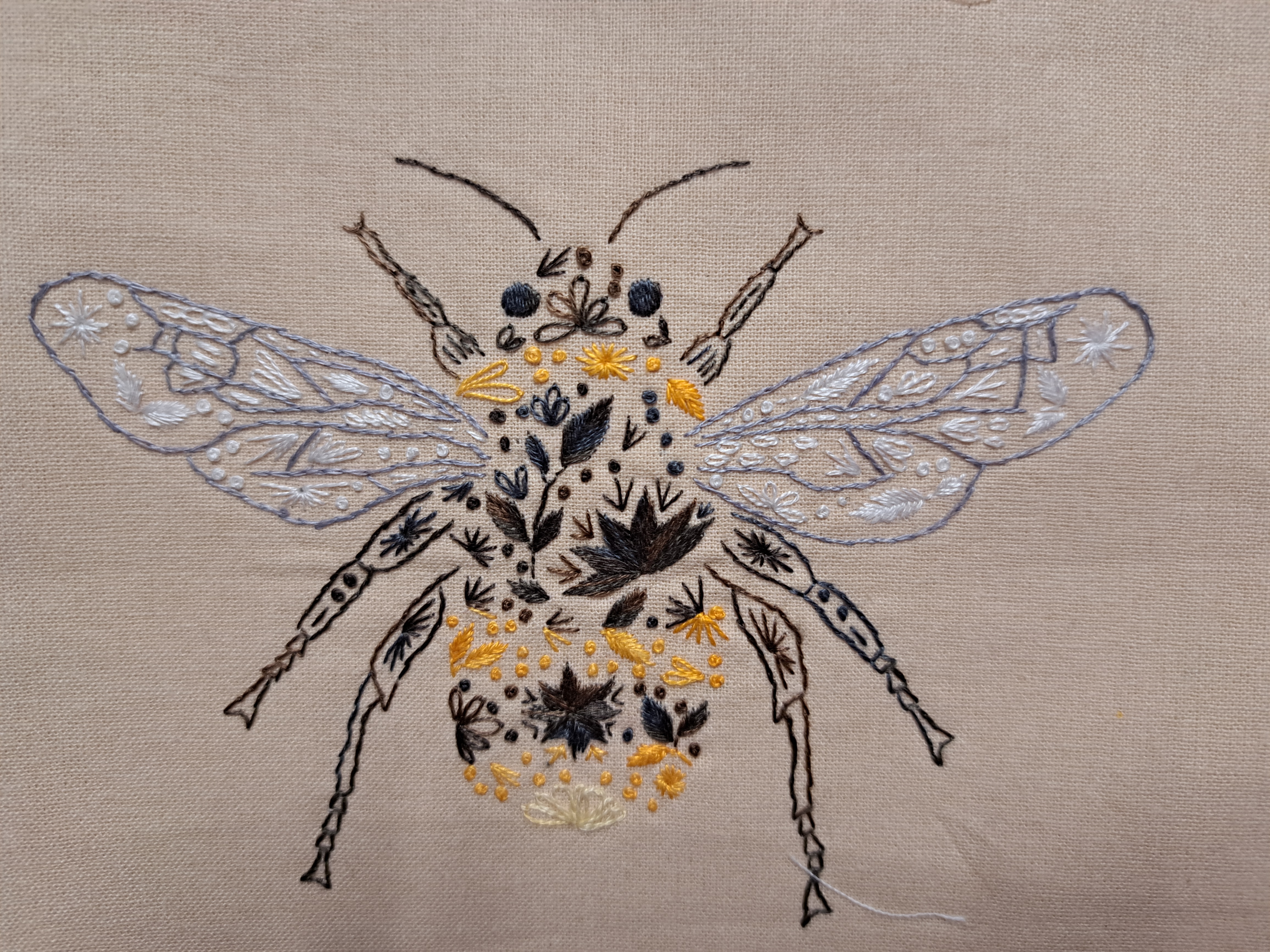 I decided to stitch another one in a similar style to the wildflower bee, similar but different! This one uses different stitches and patterns to make the bee shape. The pattern is by Nest Embroidery, again it’s on Etsy.
