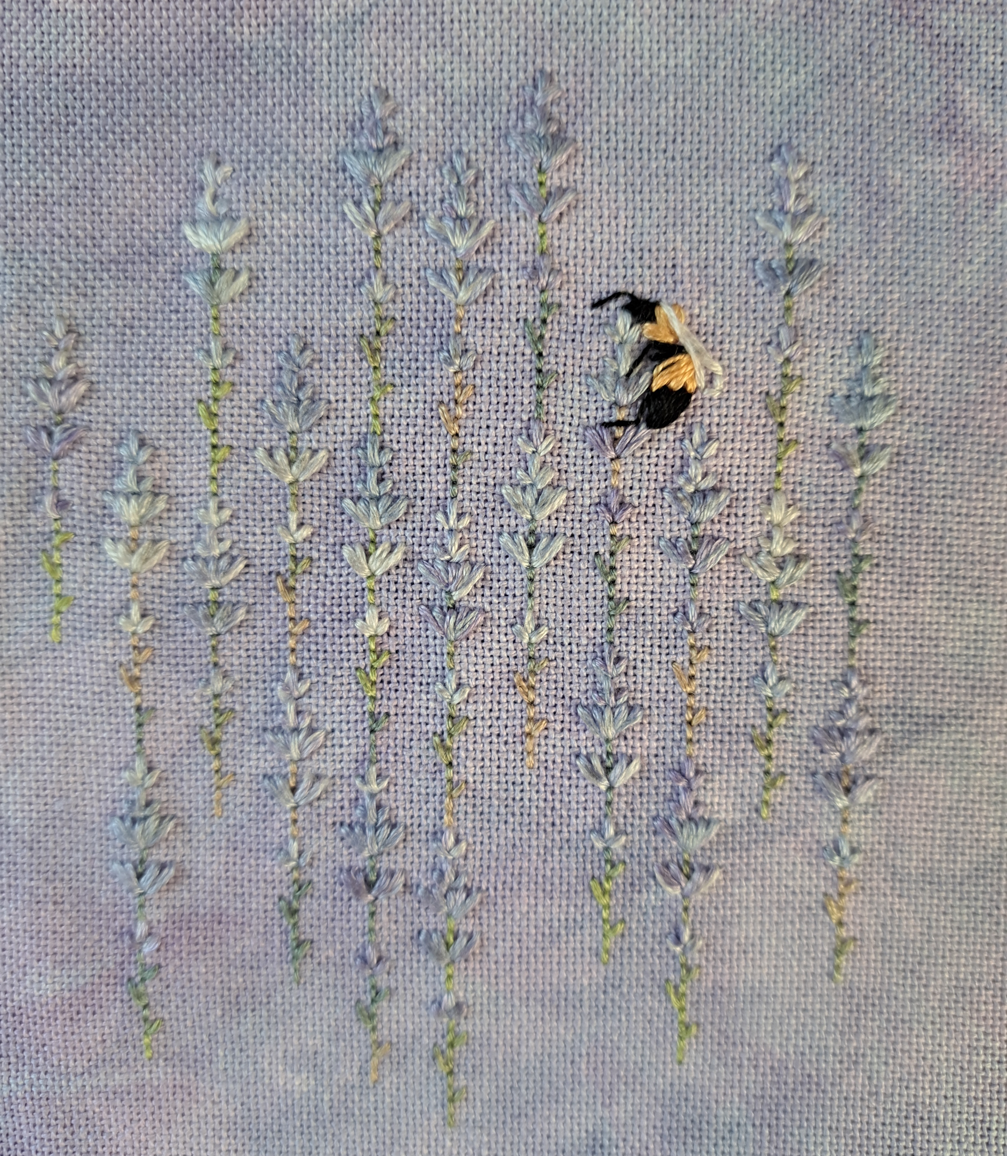 The lavender is stitched using four threads as I mentioned, but cleverly half the threads are turned so the variegation is more varied but more subtle. It’s actually one pattern repeated lots of times but it’s amazing how many mistakes you can make repeating a simple pattern!! Luckily with this design it didn’t matter if it wasn’t quite as per pattern.