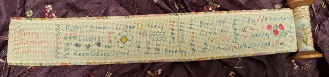 At first I was going to embroider a scene, representing the different places she lived, maybe putting major milestones on it. I was chatting to one of my friends at Skipton Stitchers and she suggested Aida bands. The idea grew on me…I found some in my stash and started writing out words to stitch. I got some inside help from her willing spouse and eventually had a good collection of places she’s lived, things she liked and major dates. I managed to arrange them in rough chronological order as a wordplay.