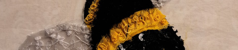 I’m trying to stitch bees using lots of different styles. This one was inspired by Laura Edgar’s bumblebee which I saw when I did a wonderful workshop with her. She uses all sorts of textiles, usually distressed in some way, and makes amazing scenes with what I would call free embroidery.