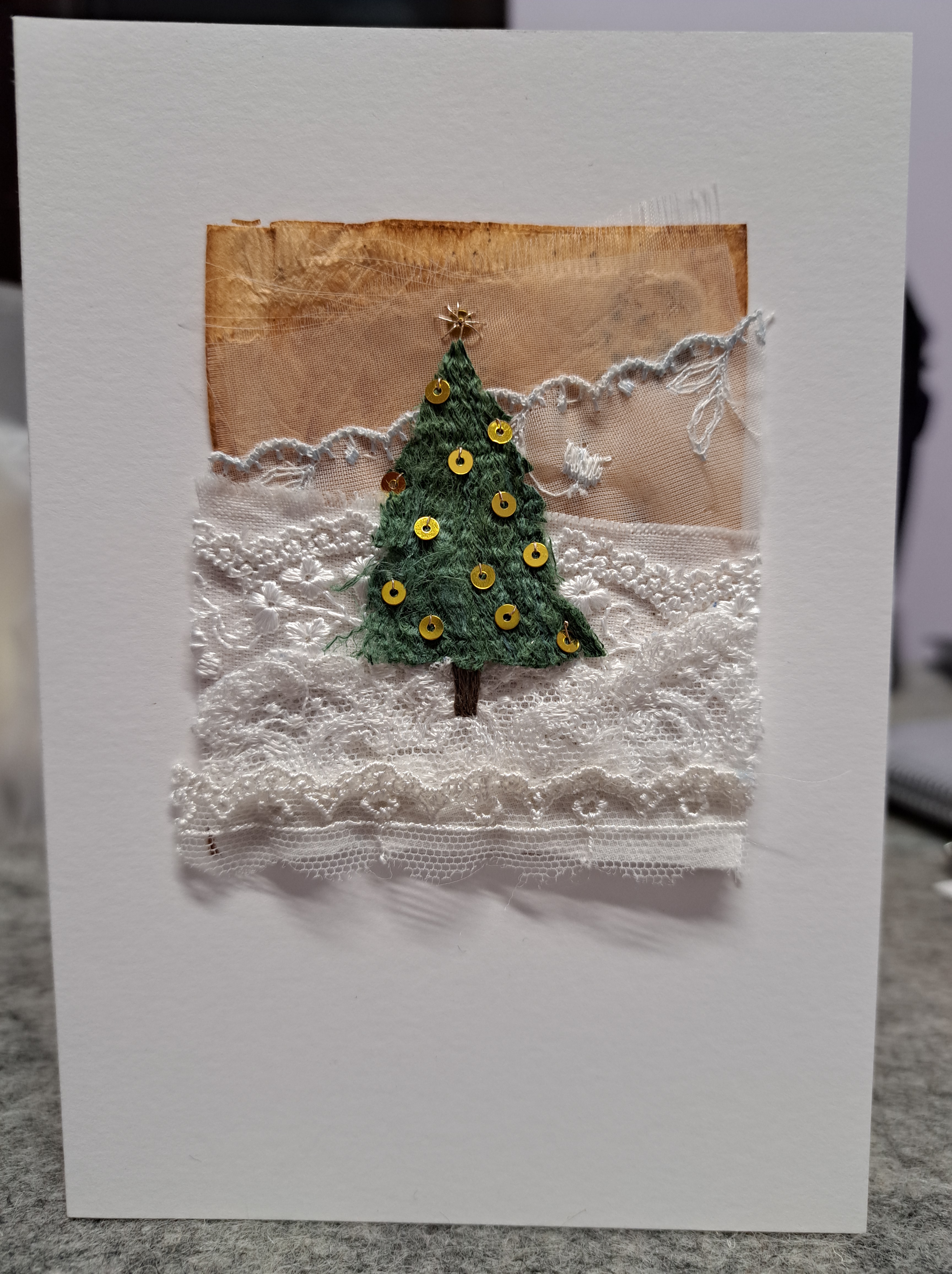 I stitched the lace in place and then stitched the tree on using tiny gold sequins left over from my bee. I made one sequin into a star on the top, added a trunk and my teabag was finished!