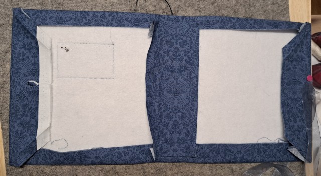 I had chosen a lovely blue bee themed fabric from Lewis and Irene. I measured round the book aiming for the cover to be 1/4″ bigger than the pages. I used some Pellon to stiffen the cover, Pellon is like a very thick vilene, like it’s probably 2mm thick. It’s also iron-on on one side. I ironed it on and put the folds in for the spine so I could work out the cover design. I always add a strip of fabric underneath the spine too, just in case it’s visible.